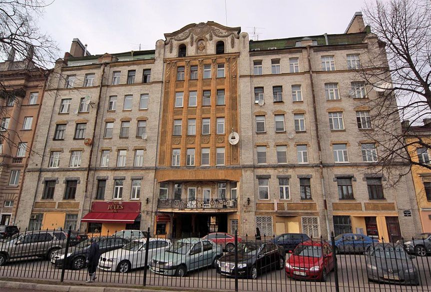 1Объемно- пространственное решение:габариты и конфигурация прямоугольного в плане, 6-ти-этажного с мансардным этажом здания, на подвалах, с двумя парадными входами, совмещенными с воротным проездом в центральной оси и расположенного на красной линии Гангутской ул.; крыши – габариты и конфигурация (скатная), материал окрытия (листовой металл) и его цвет (по результатам исторических исследований). 2Конструктивная система: исторические наружные и внутренние кирпичные капитальные стены;междуэтажные перекрытия – местоположение;плоское перекрытие воротного проезда на пилонах; две одномаршевые лестницы, ведущие к парадным подъездам, с кованым ограждением из вертикальных прутьев с верхним и нижним горизонтальными поясами, с декором из венков, тирсов, листьев аканта и розеток; покрытие пола лестничных площадок и тамбуров – материал (метлахская плитка), рисунок (геометрический и растительный орнамент), цвет (желтый/охра, пурпурный, коричневый, серый, черный); две парадные двухмаршевые лестницы с маршами по косоурам, с известняковыми ступенями, с покрытием лестничных площадок метлахской плиткой с геометрическим и растительным орнаментом, с металлическим ограждением с растительным орнаментом и деревянными поручнями; оформление потолков лестничных клеток парадных лестниц – на падуге, профилированная рама; две служебные двухмаршевые лестницы с маршами по косоурам, с известняковыми ступенями и площадками, с секциями металлического ограждения из вертикальных прутьев. 3Объемно-планировочноерешение:историческое объемно-планировочное решение в габаритах капитальных стен.4Архитектурно-художественноерешение:лицевой фасад, его архитектурно-художественное решение в стиле модерн по проекту арх. В.В. Шауба с симметричной композицией и выделением центральной части; материал и характер обработки фасадной поверхности: облицовочный кирпич, окрашенная фактурная и гладкая штукатурка, колотый гранит; материал и характер облицовки цоколя – известняк, гранит; материал и характер обработки стен воротного проезда в южной части (до металлических ворот) – облицовочный кирпич, гладкая штукатурка, фигурные филенки фактурной штукатурки; материал и характер обработки стен воротного проезда в северной части (за металлическими воротами) – облицовочный кирпич с выделением цветом декоративных элементов; вертикальные членения – гладкие лопатки с завершением в виде треугольных фронтончиков и две лопатки, фланкирующие центральную часть фасада, с полуциркульным завершением в уровне аттика, с лепным оформлением в виде выкружки с розеткой; балкон в уровне 2-го этажа на ширину центральной части фасада (в 4 световые оси), с фигурной выступающей балконной плитой, с металлическим ограждением из вертикальных прутьев, верхним горизонтальным поясом меандра, с рисунком в виде растительных завитков и гирлянд, и вертикальными вставками с розетками и фестонами; оформление центральной части фасада:в высоту 3-6-го этажей – фланкирована прямоугольными профилированными филенками фактурной штукатурки с накладными фигурными орнаментированными филенками в верхней части, декорированными геометрическим орнаментом, фестонами и картушем;стилизованные рустованные пилястры с капителями в виде маскарона и фестонами;в подоконных пространствах – прямоугольные 