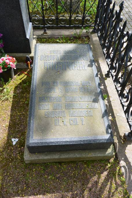 Объемно-пространственное и архитектурно-художественное решение:историческое местоположение захоронения, габариты и конфигурация надгробия (семейное захоронение); историческая надгробная плита из габбро на прямоугольном в плане гранитном основании, внутри прямоугольного в плане подиума семейного захоронения, ограниченного гранитным поребриком с оградой (рисунок ограды – вертикальные прутья и стойки, декорированные волютами, пиками); характер и содержание надгробных надписей.