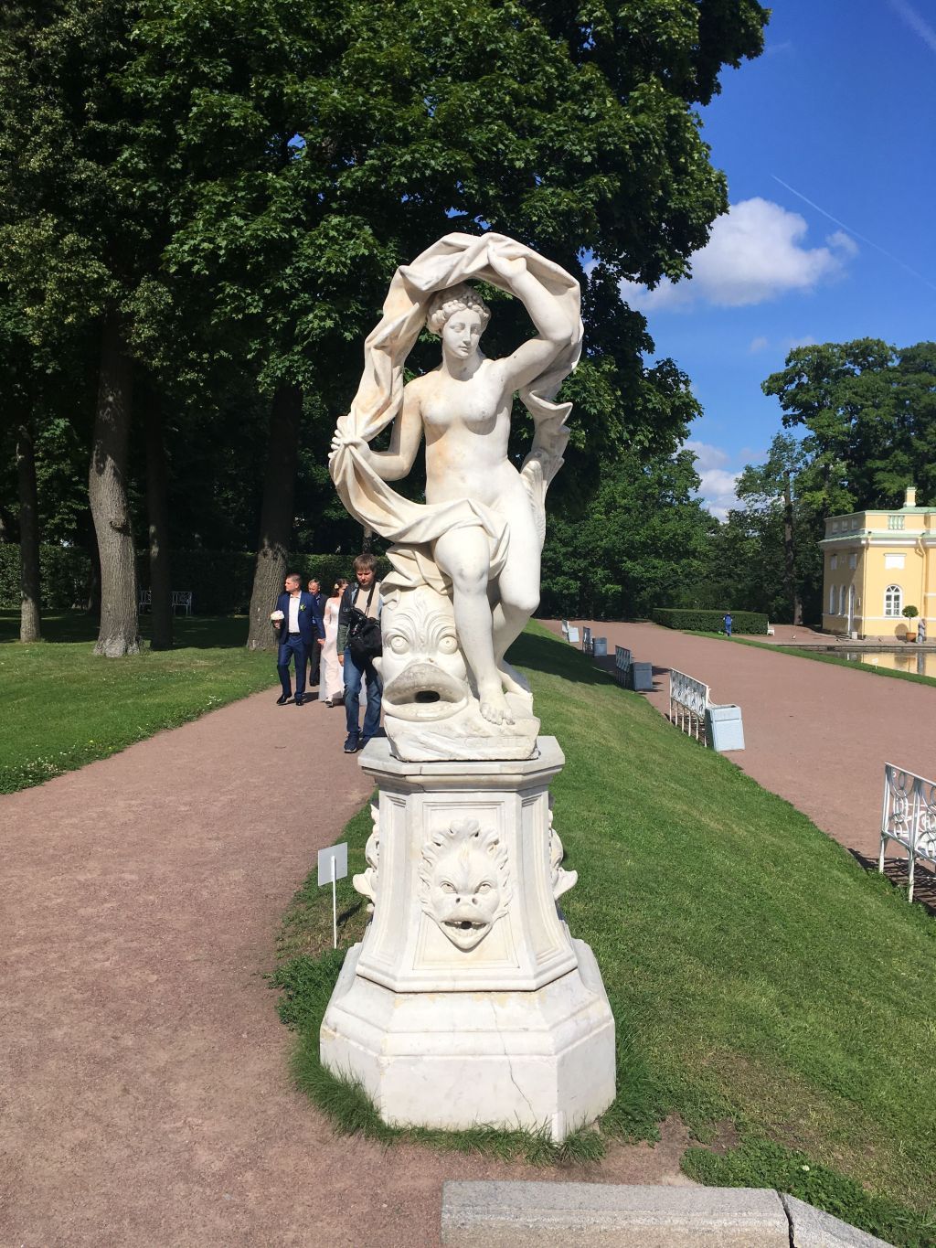 Объемно-пространственное и пластическое решение;круглая скульптура Галатеи; в виде обнаженной женской фигуры с развивающимися драпировками и фигурой дельфина у ног; надпись на плинте: «GALATEA»;нач. XVIII в., скульптор Баратта П., белый мрамор.