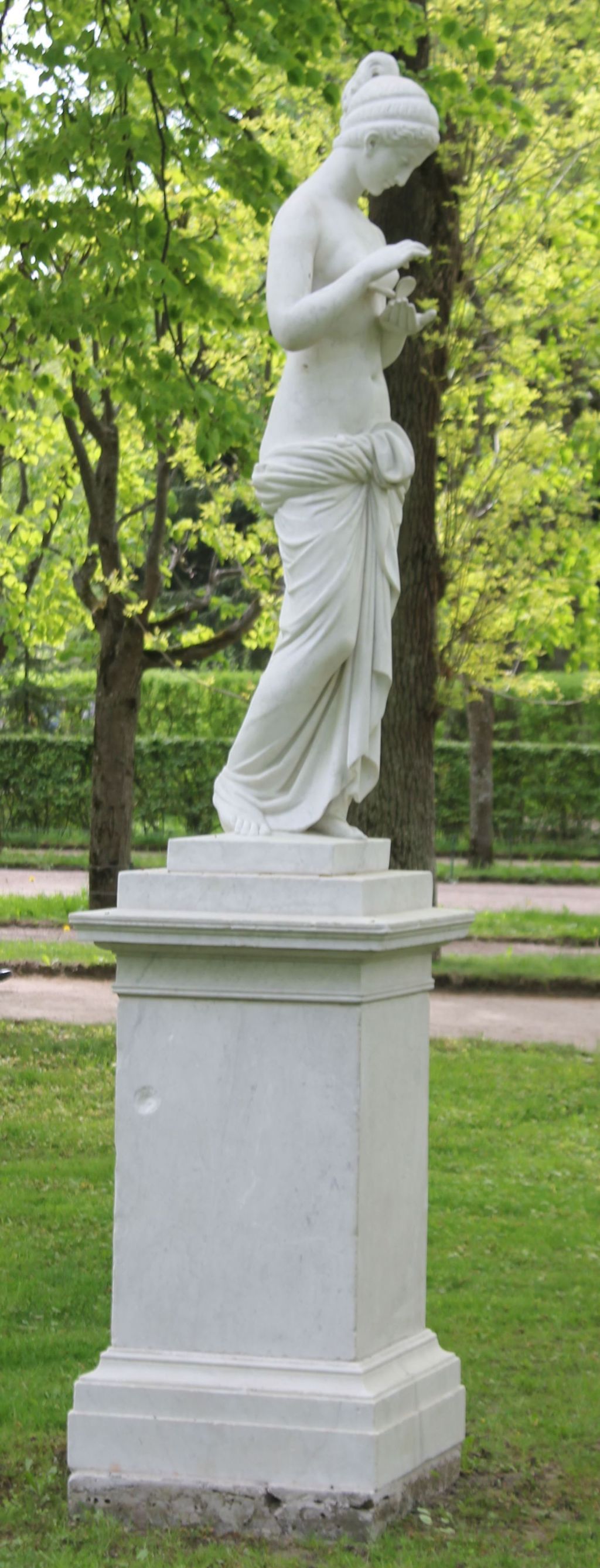Мрамор. Однофигурная полнообъёмная скульптура. Фигура Психеи выполнена в полный рост, нижняя часть закрыта драпировкой, в руках держит бабочку; голова опущена вниз;постамент – мраморный, прямоугольный, с профилированным карнизом и базой.