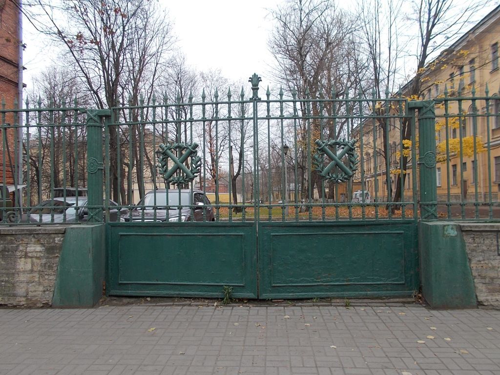 Объемно-пространственное и планировочное решение:исторические ограды: по красной линии Суворовского проспекта перед садом в курдонере Главного корпуса (Суворовский пр., 63, литера З), между восточным крылом Главного корпуса и зданием по Суворовскому пр., 63, литера Е, между западным крылом Главного корпуса и Сушильным корпусом (Суворовский пр., 63, литера А); перед лицевым фасадом Клиники для душевнобольных (Суворовский пр., 63, литера У) – местоположение, габариты. Конструктивная система:на цоколе, облицованном известняковой скобой, с оштукатуренной воротной частью и металлическими опорными столбами, материал и техника исполнения (литье, художественная ковка);металлические секции, их конфигурация, материал и техника исполнения (литье, художественная ковка). Архитектурно-художественное решение (композиция):в характере классицизма:металлическая ограда по красной линии Суворовского проспекта – на известняковом цоколе, состоящая из секций, разделенных опорными столбами, и пяти ворот, глухих в нижней части и декорированных накладными венками с военной арматурой в верхней части, ее историческое местоположение, конструкция, материал и техника исполнения (литье, художественная ковка), габариты; секции с прутьями в виде копий, в нижней и верхней тетивах – стилизованные балясинки;оформление металлических опорных столбов в виде фашин, перехваченных лентами, с овальной розеткой в средней части, оформление наверший столбов в виде лабрисов (двусторонних топориков) (часть наверший утрачена);оформление наверший воротных столбов в виде двуглавых орлов (часть наверший утрачена);металлическая ограда перед лицевым фасадом Клиники для душевнобольных (навершия столбов и секции ограды утрачены): ее историческое местоположение, конструкция, материал и техника исполнения (литье, художественная ковка), габариты.