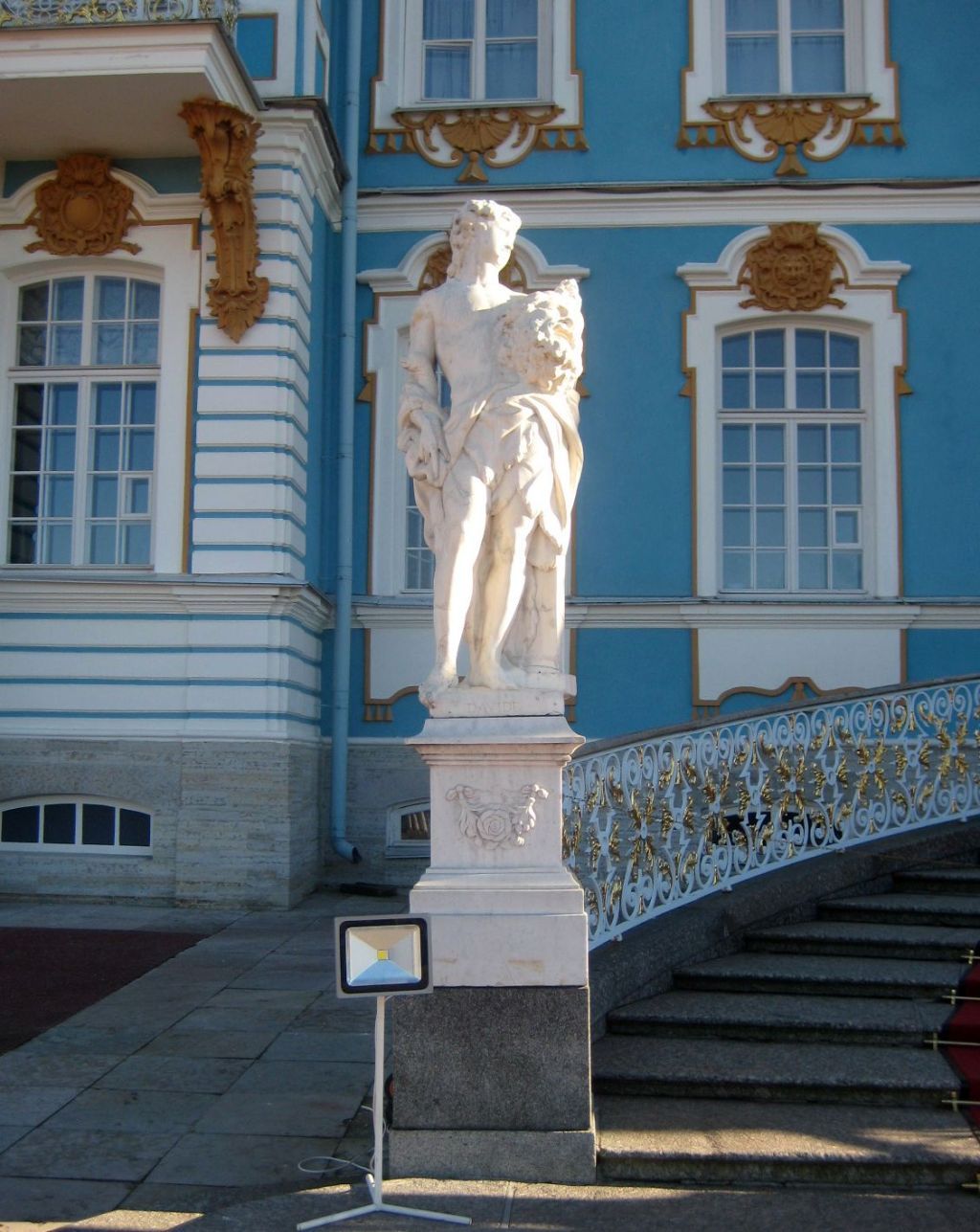 Объемно-пространственное и пластическое решение;круглая скульптура Давид; в виде мужской фигуры с драпировками и головой Голиафа в левой руке; надпись на плинте: «DAVIDE»;нач. XVIII в., скульптор А. Тарсиа, белый мрамор.
