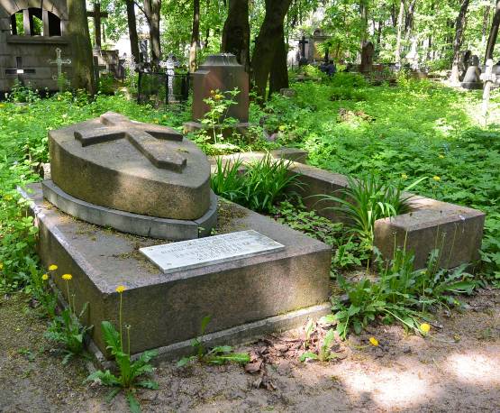 Объемно-пространственное и архитектурно-художественное решение:историческое местоположение захоронения, габариты и конфигурация надгробия (семейное захоронение); историческое надгробие в виде плиты из красного гранита в форме щита, на котором вырублен четырёхконечный крест высокого рельефа, памятник расположен на высокой площадке из гранитных блоков со скосом и подиуме-цветнике ограниченном блоками красного гранита со скосом; рельефные символы, характер и содержание надгробных надписей.