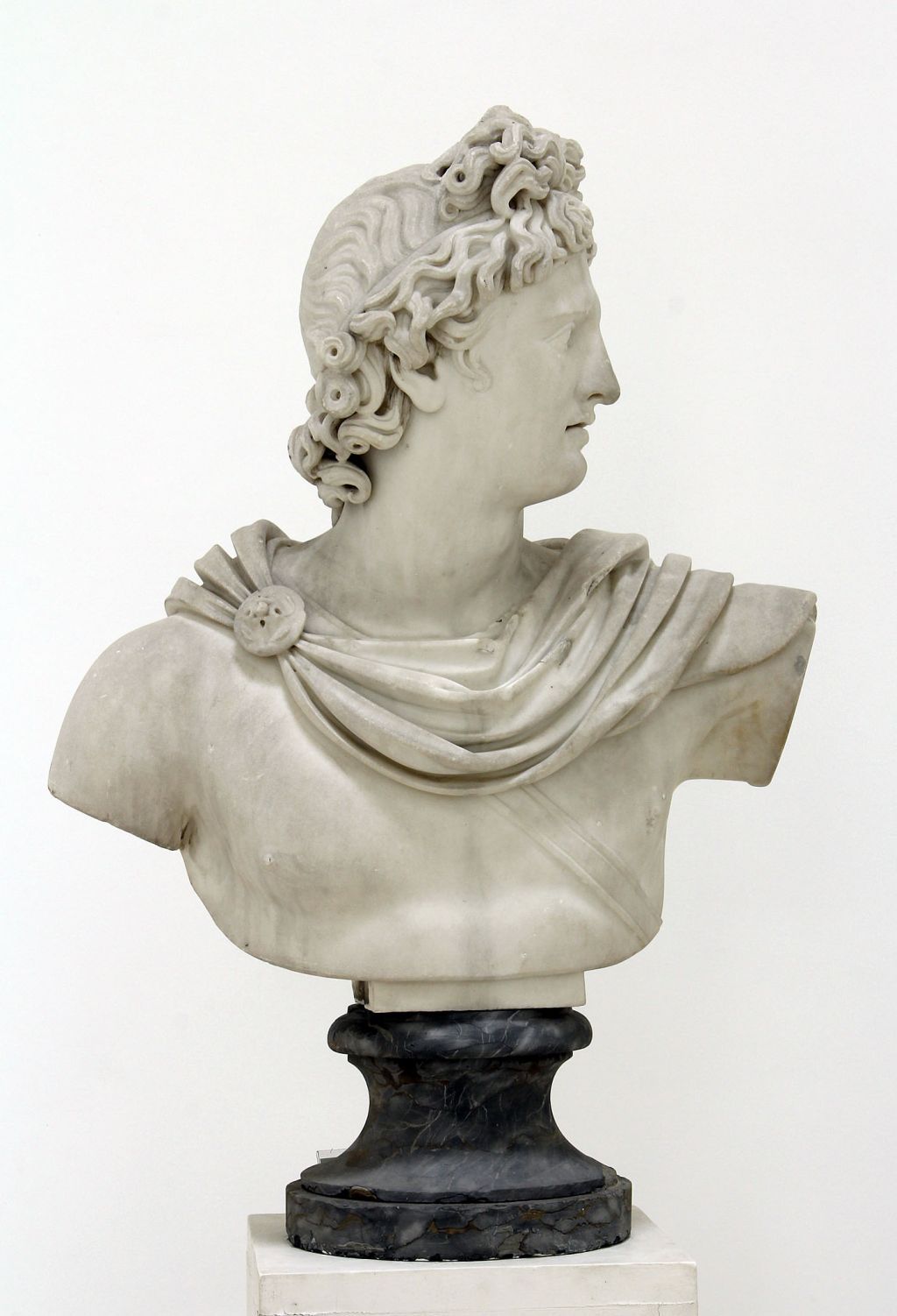 1.Объемно-пространственное и пластическое решение:бюст Аполлона Бельведерского; подгрудное изображение Аполлона с накидкой на плечах, скрепленной круглой фибулой; ножка круглая в сечении, профилированная;материал – белый мрамор, черный с прожилками мрамор;1-я пол. XIX в. (копия с оригинала скульптора Леохара).