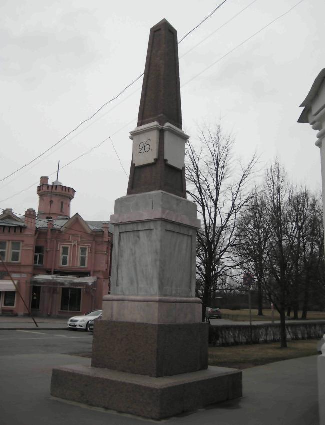 Объемно-пространственное решение:историческое местоположение, конфигурация, габариты*;четырехгранный обелиск на трехступенчатом стилобате (гранит рапакиви) на цоколе;цоколь, состоящий из центрального куба (серый с прожилками рускеальский мрамор) на плинте (розовый тивдийский мрамор) и карнизной части (розовый тивдийский мрамор);над карнизной частью - обелиск с заостренным верхом (шокшинский кварцит) на квадратном основании (серый с прожилками рускеальский мрамор);*аналогичный столб располагается по адресу: Московский проспект, у Обуховского моста.материал столба (мрамор рускеальский, тивдийский; гранит раппакиви; шокшинский кварцит, кирпич (основа))отвесные доски из белого мрамора с венчающими карнизиками;*цифры, выполненные в контррельефе, тонированные, обозначающие версты «26».*солнечные часы на мраморных досках утрачены.