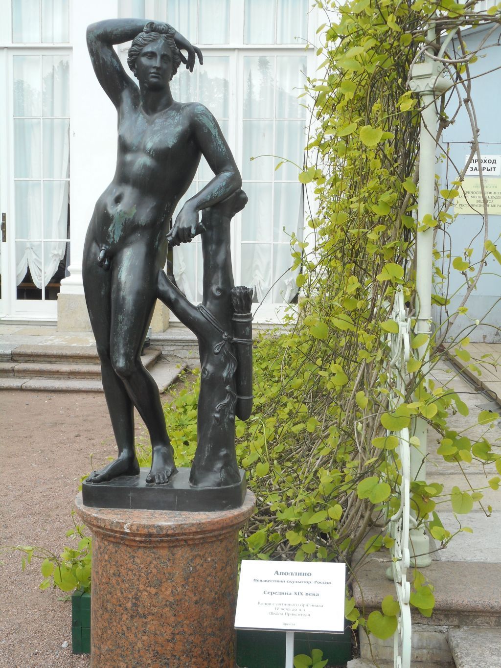 Бронза. Литье. Однофигурнаяполнообъемная скульптурная композиция.Фигура выполнена в полный рост,обнажена. Правая рука, поднята в верх заголову. Левая согнута в локте и опираетсяна дерево, на котором висит колчан стрел.Скульптура установлена на высокомгранитном постаменте.