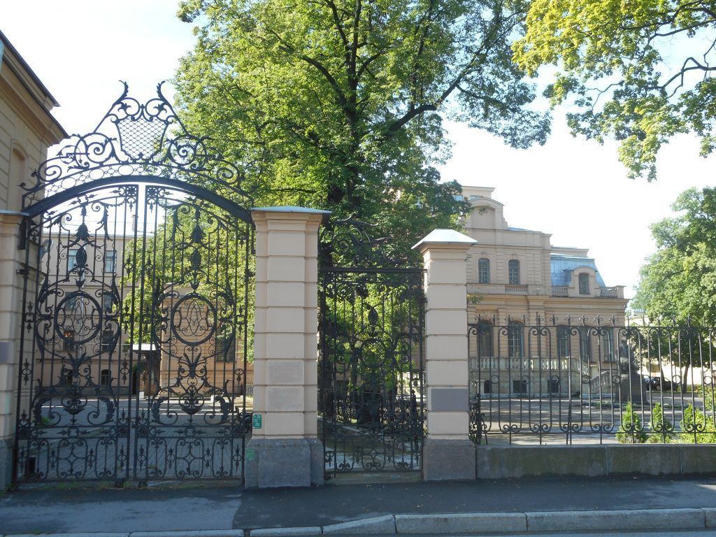 Кирпичные оштукатуренные, обработанные рустом столбы на гранитном цоколе;двустворчатые кованные металлические ворота;кованные металлические калитки;металлическое навершие с картушем;кованная металлическая решетка на гранитном цоколе;элементы решетки в виде пик и волют.
