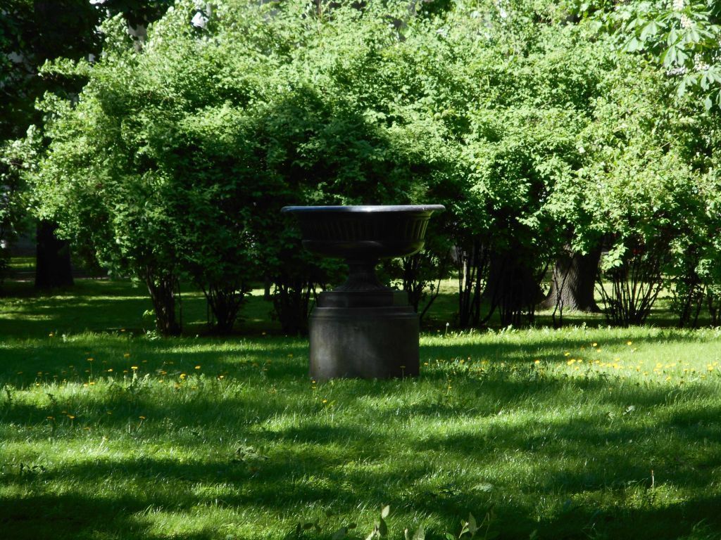Архитектурно-художественное решение:ваза садовая (гранит, рубка, резьба): на шестигранном основании, установленная на бетонном постаменте в центре большой открытой поляны по оси симметрии дворца; тулово в форме широкой чаши с выточенным краем, по окружности тулова и ножки декор в виде выточенных округлых ребер