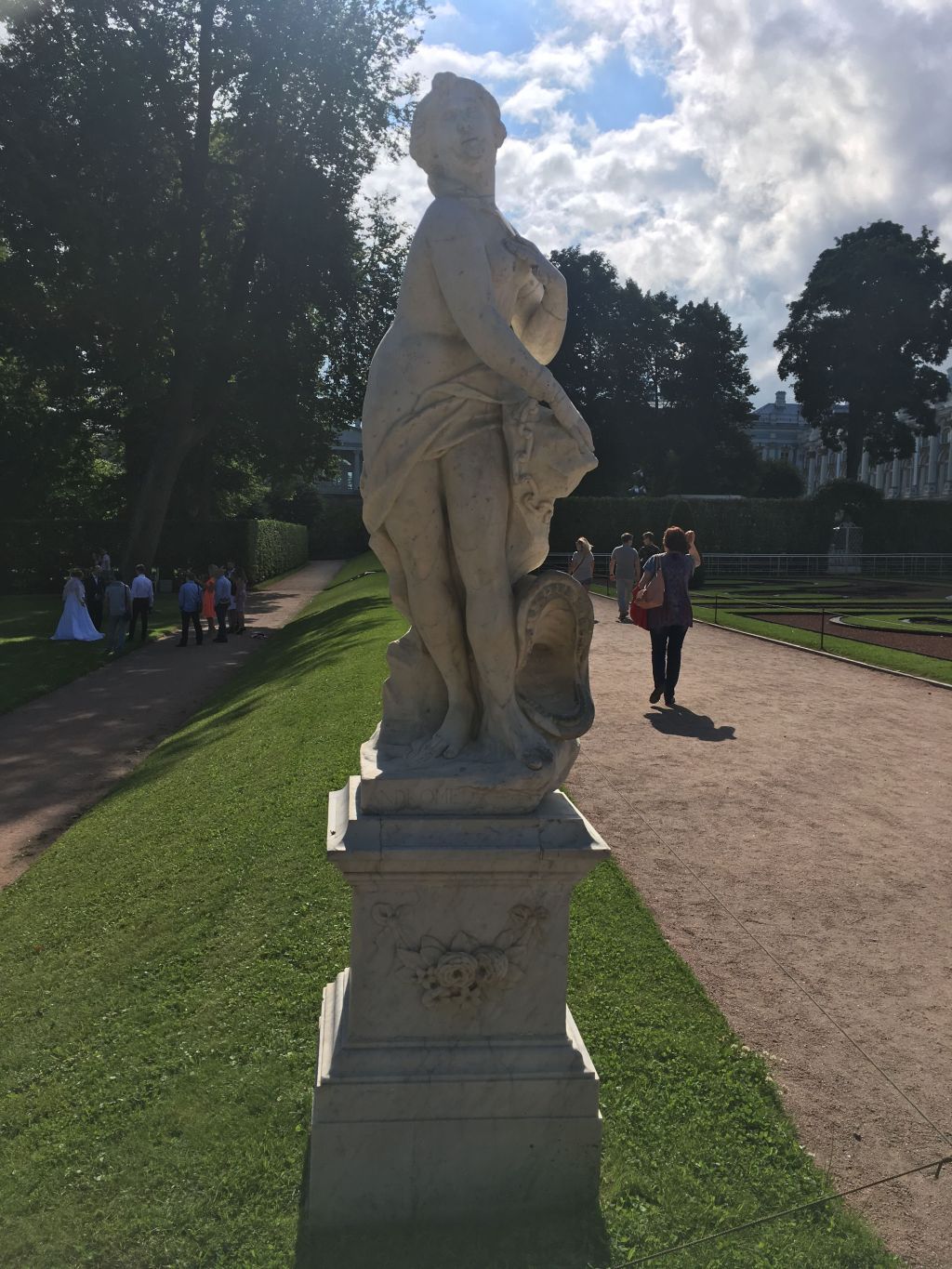 Круглая скульптура Андромеды с драпировкой на бедрах и морским чудовищем у ног;надпись на основании:«ANDROMEDA»;начало XVIII в.. белый мрамор.