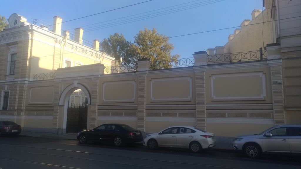 кирпичная оштукатуренная ограда со стороны Садовой улицы трехчастная: цокольная часть, продолжающая цоколь здания, основная, из чередующихся филенчатых панелей и завершающая – ограждение, выполненное в виде ажурной решетки геометрического рисунка;вся композиция разбита на пять модулей рустованными, оштукатуренными «под шубу» пилястрами, завершенными прямоугольнми в плане, оштукатуренными тумбами между звеньями металлического ограждения; в одном из модулей – воротный проезд;оформление воротного проезда с полуциркульной перемычкой:со стороны Садовой улицы - профилированный архивольт с замковым камнем клинчатой формы, обработанным под «алмазную грань», пяты архивольта опираются на стилизованные пилястры;со стороны дворовых фасадов – уплощенные архивольт и замковый камень клинчатой формы;над воротным проездом – прямоугольный аттик, образованный каменным ограждением, соединяющим две тумбы верхнего металлического ограждения; литое металлическое заполнение воротного проезда* выполнено в виде ряда копий, перехваченных горизонтальными прутьями;аналогично выполнено ограждение восточной части комплекса;(*воссоздано).