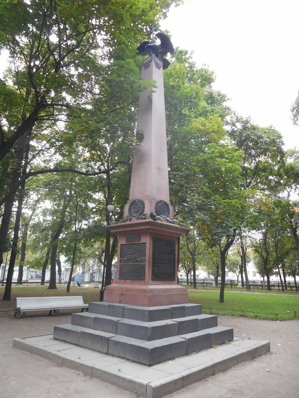 1Объемно-пространственное и планировочноерешение:исторические местоположение (в центральной части Никольского сквера с западной стороны главной планировочной оси), габариты, конфигурация; состоит из обелиска на четырехгранном высоком постаменте и трехступенчатым стилобатом, увенчан фигурой орла с крестом;мемориально-историческое значение памятника: посвящен экипажу броненосца \"Император Александр III\", погибшему в Японском море в 1905 г. 2Конструктивная система:обелиск на постаменте и стилобате, отмостка*(*поздняя)керамическими плитами с поребриком.3Архитектурно-художественное решение фасадов:авторы: князь М.С. Путятин (проект и рисунок памятника), архитектор Я.И. Филотей, скульптор А.Л. Обер;стилобат:крестообразно раскрепованный, выполнен из блоков черного карельского полированного гранита;на нижней ступени стилобата со стороны собора выбита надпись: «Томсонъ – Фуло/ Троицкая ул., 4»;постамент:красного финского полированного гранита в виде четырехгранной высокой тумбы на профилированном плинте с профилированным карнизом;на гранях постамента закреплены бронзовые доски:лицевая (восточная) сторона: сверху фигурная филенка с датой гибели броненосца \"Император Александр III\": \"14 мая 1905\"; ниже – бронзовый барельеф броненосца в бою в окружении разрывов снарядов; в правом нижнем углу выбита надпись: «А.Оберъ»;под барельефом доска с перечнем командного состава броненосца:«Командир капитан 1-го ранга Н. БУХВОСТОВ/Старший офицер капитан 1-го ранга В. ПЛЕМЯННИКОВ/Ст. ревизор лейтенант А. Воеводский 2-й/Ст. минный офицер капитан 2-го ранга К. Стааль 1-й/Младший минн. оф. лейт. В. Игнатьев/Ст. артиллерийский оф. лейт. В. Эллис 1-й/Мл. артилл. оф. лейт. Е. Демидов»;на остальных гранях пьедестала установлены бронзовые доски с перечнем фамилий погибшего экипажа броненосца;обелиск:красного финского полированного гранита, квадратный в сечении, с уплощенной муфтой в основании, декорированной филенками с треугольной верхней частью;на филенках укреплены бронзовые лавровые венки, перевязанные реющими лентами с круглыми медальонами в центре:на лицевой стороне: медальон с рельефным изображением морского якоря и датами похода эскадры Балтийского флота: «1904-1905»;на северной стороне памятника медальон с надписью литыми знаками старославянского начертания: «Больши / сея любве никтоже / имать, да кто душу / свою положить за /други своя / Еванг. Иоанна XV. 13»;на западной стороне в медальоне: «Героямъ/ Броненосца/ Императоръ/ Александръ III/ Гвардейскiй/ Экипажъ»;на южной стороне в медальоне: барельеф с картойпохода 2-й Тихоокеанской эскадры к Порт-Артуру в 1904-1905 гг.;в верхней части обелиска бронзовые лавровые венки, перевязанные бантами;в навершии бронзовый орел с распростертыми крыльями и православный крест.