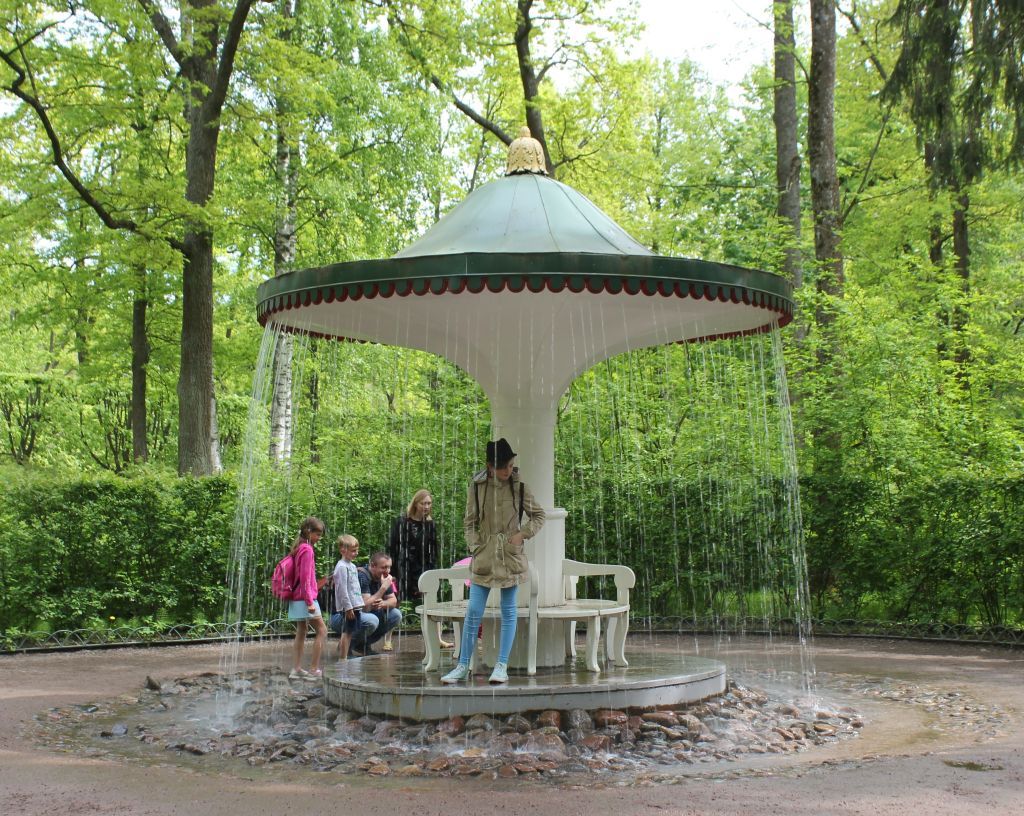 Объемно-пространственное и архитектурно-художественное решение гидротехнического сооружения*: фонтан, решенный в виде зонтика - местоположение (в куртине, примыкающей к Монплезирской алее у ее пересечения с Марлинской перспективой (по плану границ № 84)), конфигурация, габариты (высота – 4 м, диаметр фонтанного кольца – 3,64 м);материал, конструкция, механизм фонтана – установленная в центре металлической каркасной конструкции водоподводящая труба, связанная с подвесной кольцевой трубой с 164-мя форсунками, конструкция закрыта деревянной и металлической обшивкой;архитектурно-художественное решение – фигурная кровля зонтика с резными дубовыми фестонами по краю, увенчанная резным дубовым навершием из акантовых листьев, вокруг столба расположены кресла с дубовыми резными поручнями;рисунок фонтанных струй – во время действия фонтана струи бьют по краю «зонтика»;булыжное мощение вокруг деревянной площадки у основания столба, его конфигурация в плане, материал (натуральный камень); историческое цветовое решение.* воссоздание в 1954 г.