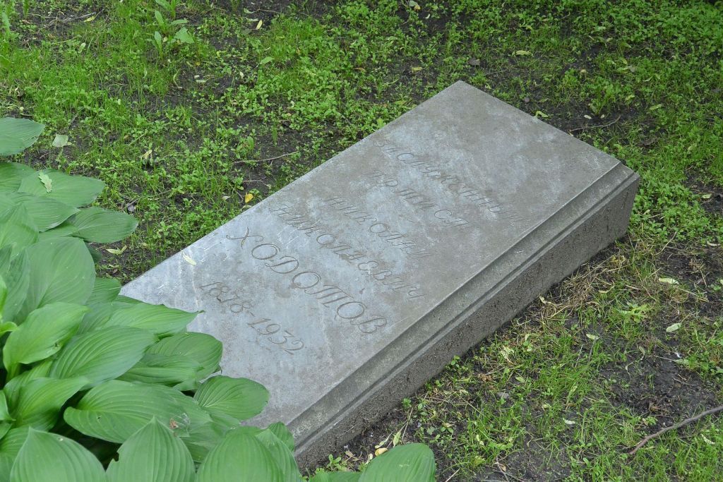 Объемно-пространственное и планировочное решение территории: местоположение участка в юго-восточной части Некрополя с южной стороны Главной дорожки у пересечения с 3-й Поперечной дорожкой (прах перенесён со Смоленского кладбища в 1936 году с установкой новой плиты); захоронения в границах участка.Объемно-пространственное и архитектурно-художественное решение:габариты и конфигурация надгробия; надгробие в виде массивной прямоугольной профилированной каменной плиты, на верхней поверхности которой высечены контррельефные шрифтовые литеры мемориальной надписи, плита расположена на травяном газоне; характер и содержание надгробных надписей.