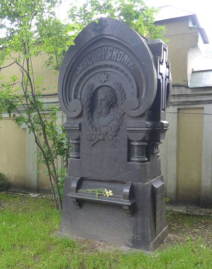 Объемно-пространственное и архитектурно-художественное решение: историческое местоположение захоронения и конфигурация надгробия; авторское художественное решение надгробия из габбро в виде фигурной сложнопрофилированной стелы из габбро, орнаментированной резными архитектурными деталями (колонки, кокошники), декоративными элементами символического (кресты, звёзды), в центре лицевой поверхности в овальной нише высечен портретный рельеф в обрамлении рельефного лаврового венка рельефные символы, характер и содержание надгробных надписей.