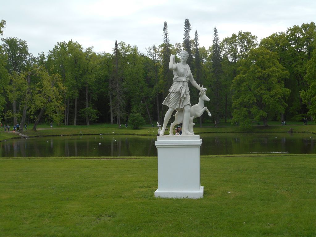 Мрамор. Двухфигурная полнообъемнаяскульптурная композиция. Артемида одетав дорийский хитон и гиматий. Правойрукой она готовится извлечь из колчанастрелу, левая на голове оленёнка. Головаповёрнута вправо. Скульптура установленана высоком постаменте.