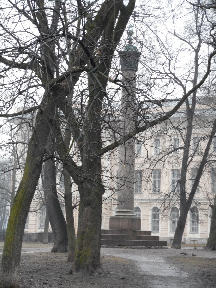 Объемно-пространственноерешение: историческое местоположениемонумента в центральной части садана искусственном холме;габариты и конфигурация колонны,установленной на трехступенчатомстилобате и кубическом постаменте,и увенчанной капителью сдекоративным навершием. Конструктивнаясистема: конструктивное решение колоннына трехступенчатом стилобате икубическом постаменте. Архитектурно-художественноерешение: трехступенчатое основание-стилобат и кубический постамент изгранита,профилированная база колонны изгранодиорита;гладкий ствол колонны из гранита-рапакиви; стилизованная капитель колонны избронзы с изображением трехкрылатых гениев и надписями(«Архитектура», Скульптура»,«Живопись»);навершие в виде бронзовой лиры напирамидальном основании срастительным орнаментом.