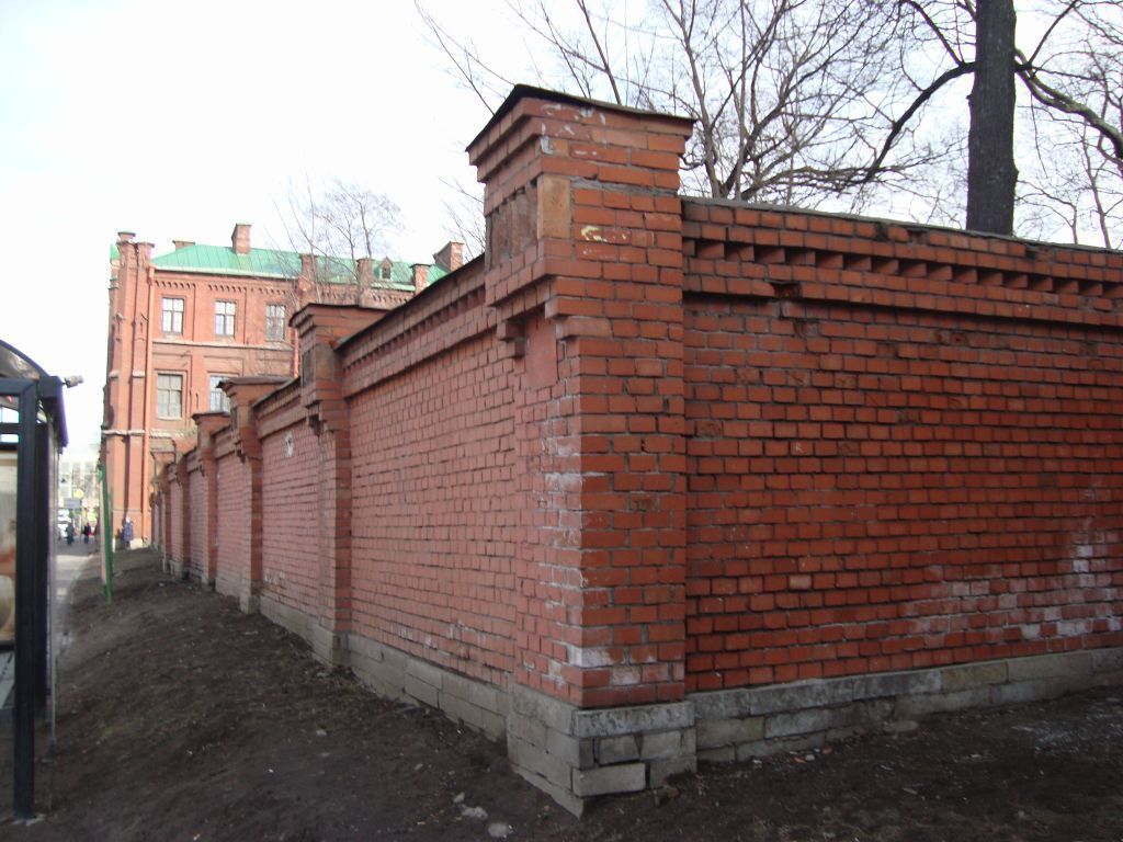 Объемно-пространственное решение и конструктивная система:кирпичная ограда с металлическим окрытием – местоположение (в южной части по Лиговскому пр., угол Лиговского пр. и ул. Некрасова, вдоль ул. Некрасова), габариты и конфигурация в плане;столбы-пилоны.Архитектурно-художественное решение фасадов:известняковый цоколь;материал и характер отделки фасадной поверхности – лицевой кирпич;оформление столбов-пилонов в виде пилястр, с навершием, декорированным пильчатым фризом, на ступенчатых консолях;профилированный венчающий карниз с пильчатым фризом.