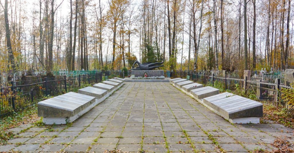 Объемно-пространственное и планировочное решение территории:местоположение мемориала в левобережной зоне р. Ижоры в центральной части поселкового кладбища с южной стороны Петрозаводского шоссе;захоронения в границах территории участка мемориала;архитектурно-планировочное решение «Братского захоронения» в виде прямоугольной площадки, ориентированной с северо-востока на юго-запад, с расположенными на ней вдоль центральной планировочной оси монументально-декоративными элементами, местоположение скульптурной доминанты, мемориальных плит, малых архитектурных форм, ограды, сложившиеся между ними визуальные связи;озеленение территории травяными газонами и кустарниковыми боскетами.Объемно-пространственное и архитектурно-художественное решение:архитектурно-художественное решение мемориала в виде прямоугольной площадки, мощёной гранитными плитами, на которой по сторонам центральной планировочной оси расположены на бетонных основаниях ряды мемориальных плит из полированного серого гранита, на верхних наклонных поверхностях плит высечены и тонированы белым контррельефные шрифтовые литеры;оформление юго-восточной замыкающей части центральной планировочной оси мемориала монументальной архитектурно-декоративной композицией в виде горизонтально расположенной скульптуры из бетона «Раненый воин» на прямоугольном в плане пьедестале, облицованном плитами полированного серого гранита, на прямоугольном в плане подиуме с цветником (на лицевой поверхности пьедестала расположены объёмные металлические тонированные под золото шрифтовые литеры);трассировка металлической ограды, расположенной с 3-х сторон периметра мемориала, расположение главного входа с юго-восточной стороны; рельефные символы, содержание и характерные особенности мемориальных надписей.