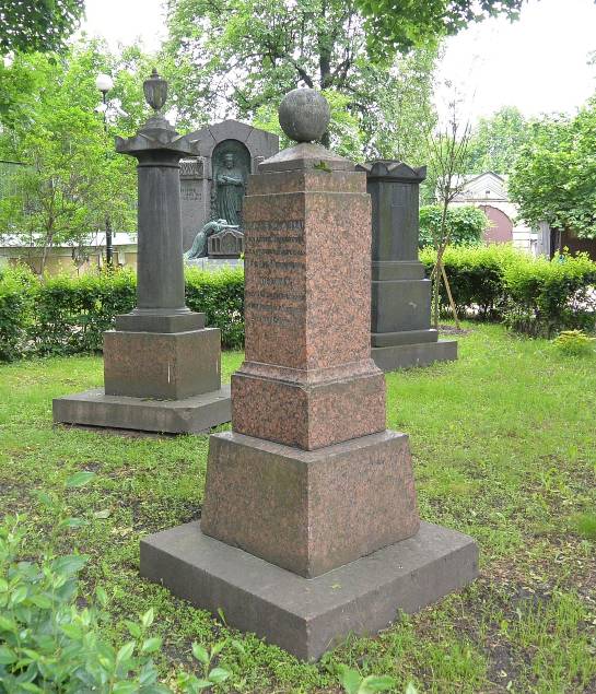 Объемно-пространственное и архитектурно-художественное решение:историческое местоположение захоронения и конфигурация надгробия; историческое решение надгробия в виде квадратной в плане ступенчатой профилированной стелы-обелиска из красного гранита, с навершием в виде шара на пирамидальном завершении стелы, на двухступенчатом квадратном в плане основании из красного гранита;характер и содержание надгробных надписей.