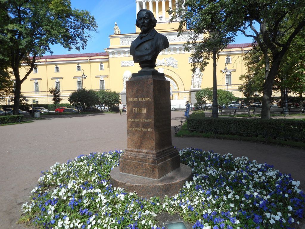 Объемно-пространственное и архитектурно-художественное решение: бюст Глинки М.И. (бронза, литье), четырехгранный пьедестал (красный питерлакский гранит);плинт круглый в плане (гранит).характер и содержание надписей и нотных знаков (контррельеф, золочение).