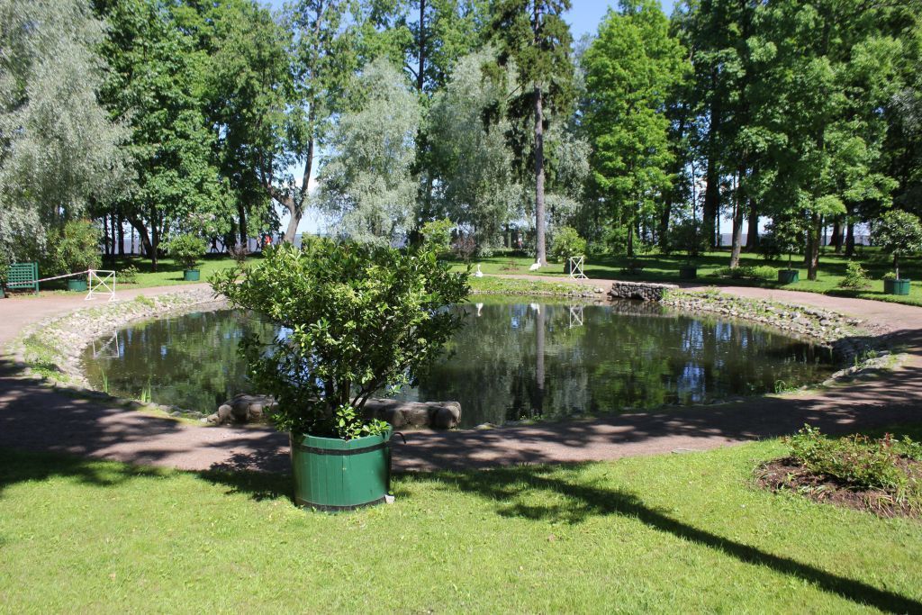 Гидротехническое сооружение:историческое местоположение (расположен с восточной стороны восточного Вольера по центральной продольной оси Менажерийнгого сада, проходящей по оси с фонтаном «Солнце»), габариты и конфигурация вытянутого в плане эллипсоидного пруда* на полукруглой площадке;* пруд восстановлен во время реставрации 2004-2005гг. мелиоративной системы восточной части парка.откосы и дно пруда вымощены булыжным камнем.