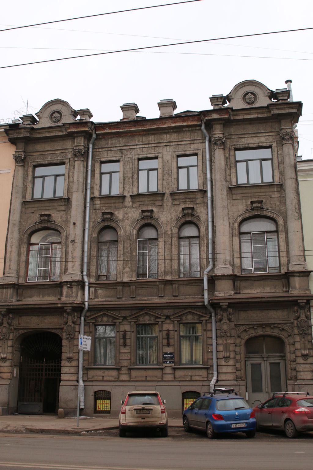 Объемно-пространственноерешение:исторические габариты и конфигурация прямоугольного в плане трехэтажного здания на высоком цоколе, с двухэтажным восточным и трехэтажным северным дворовыми флигелями, образующими открытый внутренний двор; прямоугольный в плане воротный проезд южного лицевого фасада;историческая* форма, габариты и конфигурация скатных крыш, высотная отметка коньков;(*по результатам историко-архивных изысканий, в настоящее время надстроены мансарды);фундаменты,наружные и внутренние капитальные стены (кирпичные);исторические отметки междуэтажных перекрытий; исторические лестницы: лестничные клетки и вестибюли, их объемно – планировочное решение;парадная лестница (Л-1):вход организован со стороны южного лицевого фасада - двухмаршевая, на металлических консолях; ступени выполнены из белого мрамора;мраморное ажурное ограждение, орнаментированное квадрифолиями, с прямоугольными в сечении филенчатыми стойками;переход в четырнадцать ступеней между уровнями вестибюля: ступени облицованы белым мрамором;ограждение выполнено в виде балюстрады из граненых каннелированных балясин из белого мрамора с темно-серыми вставками, под профилированным поручнем;дворовая лестница (Л-2), вход организован со стороны западного фасада северного дворового корпуса:трехмаршевая на косоурах, ступени выполнены из лещадной плиты; металлическое кованое ограждение выполнено в виде чередующихся прямоугольных и круглых в сечении стоек под деревянным профилированным поручнем;на полу площадок - двуцветная метлахская плитка: чередующиеся шестигранники темно-серого и песочного цвета, образующие орнамент «соты»;деревянная лестница, ведущая в жилые помещения:дугообразная в плане, в один марш;деревянное, резное ограждение лестницы;по первой световой оси южного лицевого фасада расположен воротный проезд, с коробовым, кессонированным сводом в южной его части и плоским перекрытием, декорированным филенками в центральной и северной частяхисторическое объемно-планировочное решение в габаритах капитальных стен, в том числе габариты помещений с художественно-декоративной отделкой.восточные фасады трех флигелей - решены как брандмауэрные стены;южный, лицевой фасад, выходящий на красную линию застройки Кирочной улицы, решен в приемах неоклассицизма; фасад облицован природным камнем (песчаник ?), в уровне первого этажа - рустован;фасад шириной в пять световых осей - трехчастный: боковые части шириной в одну световую ось в уровне первого этажа акцентированы симметричными относительно центральной оси фасада проемами с трехцентровым завершением, фланкированными горельефными фигурами атлантов;в уровне второго-третьего этажей - полуколоннами коринфского ордера на высоких пьедесталах, несущими антаблемент с профилированным карнизом;боковые части фасада завершены фигурными аттиками с рельефными львиными маскаронами, вписанными в круглые ниши, фланкированными прямоугольными в сечении кирпичными оштукатуренными тумбами;ограждение центральной части фасада - прямоугольные в сечении кирпичные оштукатуренные тумбы;воротный проезд с трехцентровым завершением декорирован профилированным архивольтом, над которым расположена прямоугольная рамка с вписанной в ее поле филенкой, образованные треугольные поля заполнены лепным раст