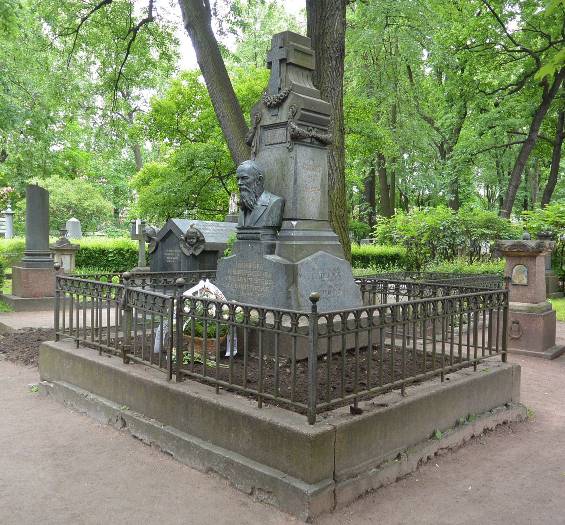 Объемно-пространственное и архитектурно-художественное решение:историческое местоположение захоронения и конфигурация надгробия; авторское художественное решение надгробия из гранита в виде сложно-пропрофилированной стелы, на лицевой поверхности которой установлен бронзовый портретный бюст, стела расположена на земляной площадке ограниченной высоким гранитным поребриком с металлической оградой из прутьев квадратного сечения, колец и стоек с шарами; рельефные символы, характер и содержание надгробных надписей.