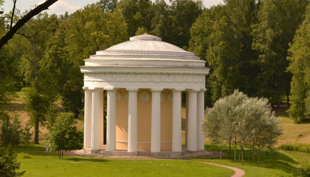 Объемно-пространственное и планировочное решение территории: местоположение в центральной части парка, в долине реки Славянки.Объемно-пространственное решение:павильон-ротонда на высоком известняковом ступенчатом стилобате с колоннадой по окружности, завершенный куполом;купол с лантерной со световым фонарем, высотные отметки купола. Конструктивная система здания:фундаменты; наружные и внутренние кирпичные капитальные стены; конструкции купола, колонны.Объемно-планировочное решение:объемно-планировочное решение в габаритах зала.Архитектурно-художественное решение: архитектурно-художественное решение в формах классицизма; материал и характер фасадной поверхности – гладкая штукатурка; ступенчатый известняковый стилобат; дверной проем - габариты, конфигурация (прямоугольный), местоположение; входной портал, профилированный с прямым сандриком; надпись над дверным проемом: «Любовь, почтение и благодарность посвятили»; дверное заполнение деревянное двухстворчатое, филёнчатое, с порезками в филенках, металлическими круглыми накладками, декорированными растительным и геометрическим орнаментом, историческая фурнитура; каннелированные колонны дорического ордера; известняковые крыльца между парами колонн;круглые лепные медальоны в верхней части стены в просветах колонн, с изображением аллегорий «Вручение дарственной грамоты наследнику», «Минерва-Виктория», «Справедливость» и «Щедрость», над медальонами по окружности лепные растительные гирлянды, перевитые лентой;оформление перекрытия галереи – кессоны с круглыми лепными розетками с акантовыми листьями;покрытие пола галереи – известняковые плиты;полный дорический антаблемент с архитравом, фризом с триглифами и метопами, гуттами, профилированным карнизом; лепные композиции в метопах с изображением дельфинов и венков из сухой и цветущей виноградной лозы;световой фонарь в лантерне;ступенчатое основание купола.Декоративно-художественная отделка интерьеров: покрытие пола – мраморные плиты с радиальным рисунком;ниши с полуциркульными завершениями и конхами;профилированный карниз по окружности стены;архивольты лепными гирляндами сухой и цветущей виноградной лозы, оформляющие арки ниш; лепные лавровые венки с лентами в антрвольтах;оформление свода купола кессоны с орнаментальными поясами, круглыми лепными растительными розетками;ложные окна по окружности лантерны в профилированных наличниках.
