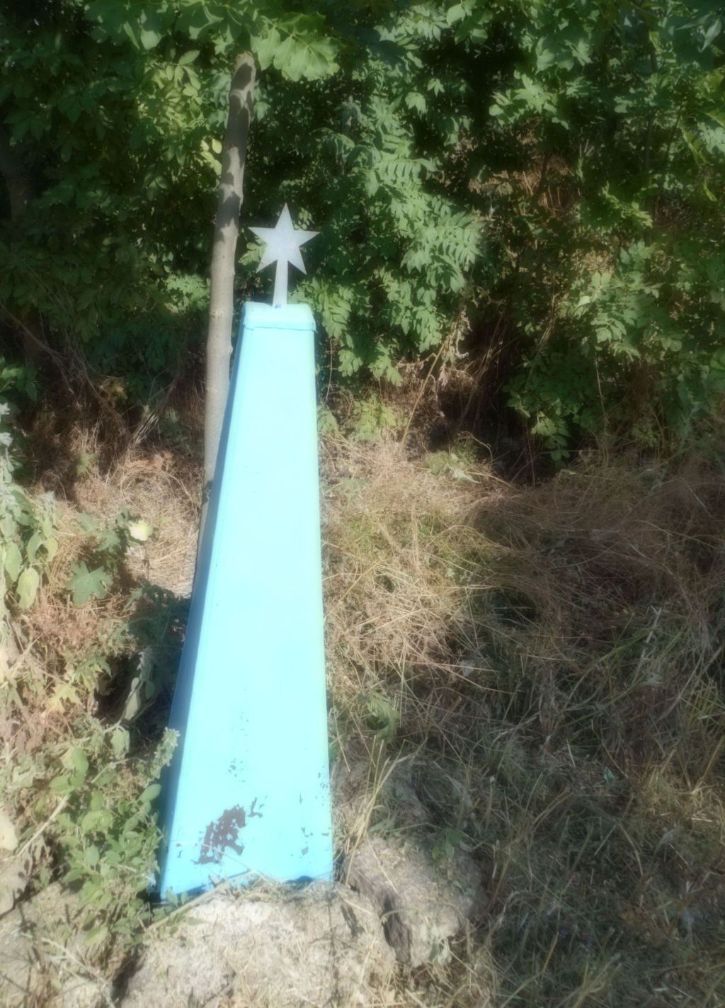 Захоронение (могила) в полном объеме от поверхности земли, включая сопровождавшие захоронение материалы;архитектурно - композиционное решение памятника, представленное металлическим некрашеным пирамидальным обелиском со срезанной верх¬ней площадкой; обелиск без основания и дополнительных платформ вкопан прямо в землю.