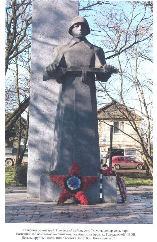 Предметом охраны объекта культурного наследия регионального значения -«Памятник 343 воинам-односельчанам, погибшим на фронтах гражданской и Великой Отечественной войн», 1967 год, расположенного по адресу: Ставропольский край, Грачевский район, с. Тугулук, центр села (далее - мемориальный комплекс), являются:1) Местоположение мемориального комплекса на территории застройки населенного пункта;2) Объемно-пространственная композиция мемориального комплекса, габариты, геометрические формы, высотные отметки и расположение элементов и частей памятника;3) Архитектурные элементы:стела с расположенной вверху в технике плоского рельефа надписью «1941-1945»;скульптура воина с автоматом в руках; мемориальная стена с досками с фамилиями и инициалами погибших земляков и с надписью: «ЗЕМЛЯКАМ ПАВШИМ В БОЯХ ЗА РОДИНУ СЛАВА»;подиум с размерами в плане 13,0х12,7 м и высотой 0, 75 м со ступенями расположенными с двух сторон;Огонь Вечной Славы (конструкция отлитая из чугуна в виде декоративной решетки и пятиконечный звезды);памятная плита «Послание потомкам».