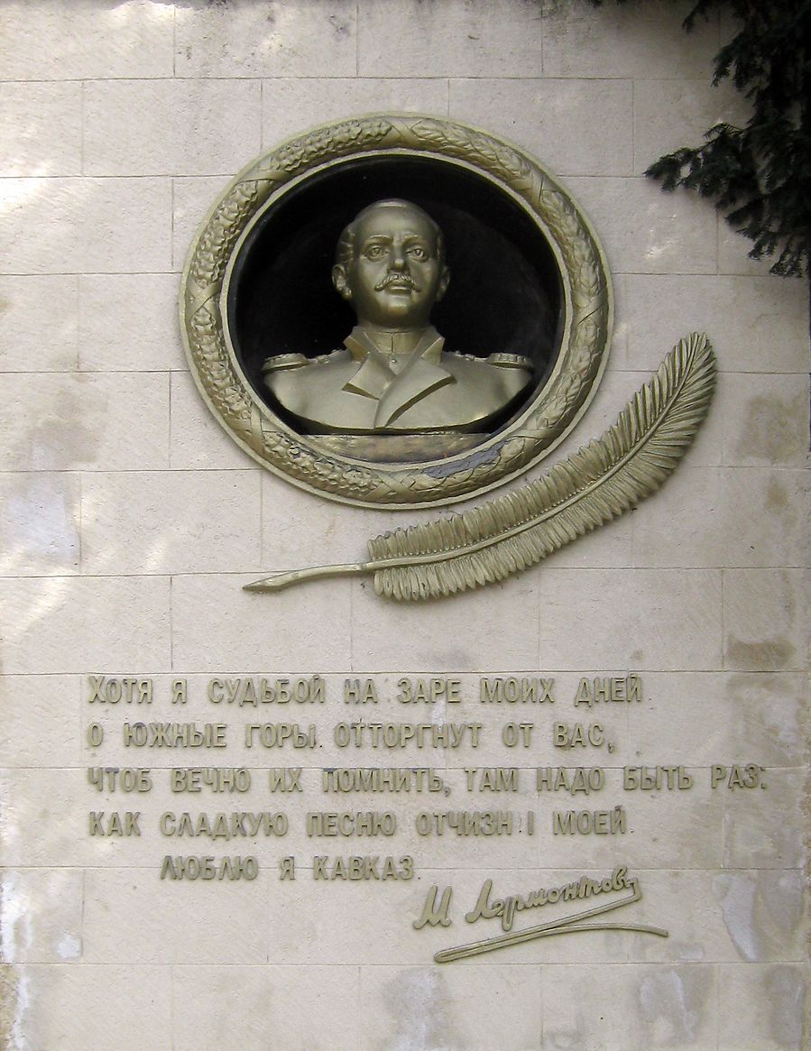 1. Местоположение памятника на терриотрии Кисловодского курортного парка, в его нижней части. Памячтник из желтого песчаника с лестницами в три марша находится напротив Колоннады, рядом с Нарзанной галереей, на бывшем береговой обрыве реки Ольховки.2. Объемно-планировочная композиция памятника: габаритные размеры, форма и материал - природный желтый песчанник, на котором размещен бюст М.Ю. Лермотова.3. Объемно-планировочная композиция бюста: габаритные размеры, форма бюста, пера под ним, надписи:\"Хотя я судьбой на заре моих дней, о южные горы, отторгнут от вас, чтоб вечно их помнить, там надо быть раз: как сладкую песню отчизны моей, люблю я Кавказ. М.Лермонтов\".4. Местоположение, форма, конструкция лестниц.5. Габариты и форма двух цветочных ваз.
