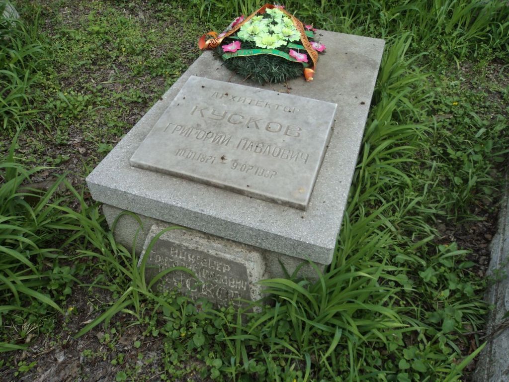 Предметом охраны объекта культурного наследия региональногозначения «Могила Г.П. Кускова, архитектора (1871-1937)», 1871-1937 годы,расположенного по адресу: Ставропольский край, г. Ставрополь, Успенскоекладбище (далее – памятник), являются следующие его составляющие:1. Местоположение памятника в восточной части городаСтаврополя, на территории Успенского кладбища, с запада от главноговхода:- Памятник2. Секторы и направления видовых раскрытий памятника натерритории Успенского кладбища:4. Местоположение и габариты прямоугольного надгробия (длина -1,4 м; ширина - 0,8 м; высота - 0,38 м). Материал исполнения – природныйкамень, мозаичный бетон. Вид отделки вертикальных поверхностей –фактурная обработка. А также, памятная плита, установленная сверху свысеченной памятной надписью на поверхности:«АрхитекторКусковГригорий Павлович10.01.1871 – 9.07.1937»Габариты – 0,5х06м. Материал исполнения – природный камень светло-серого цвета:4. Местоположение (с восточной стороны прямоугольного надгробия) игабариты надгробного камня трапециевидной формы (длина по верху - 0,37м;длина по низу - 0,5м; высота - 0,25м), с высеченной памятной надписью налицевой поверхности:«ИНЖЕНЕРГригорий ПавловичКУСКОВскончался 9/VII 1937г.»Материал исполнения – природный камень светлого цвета.