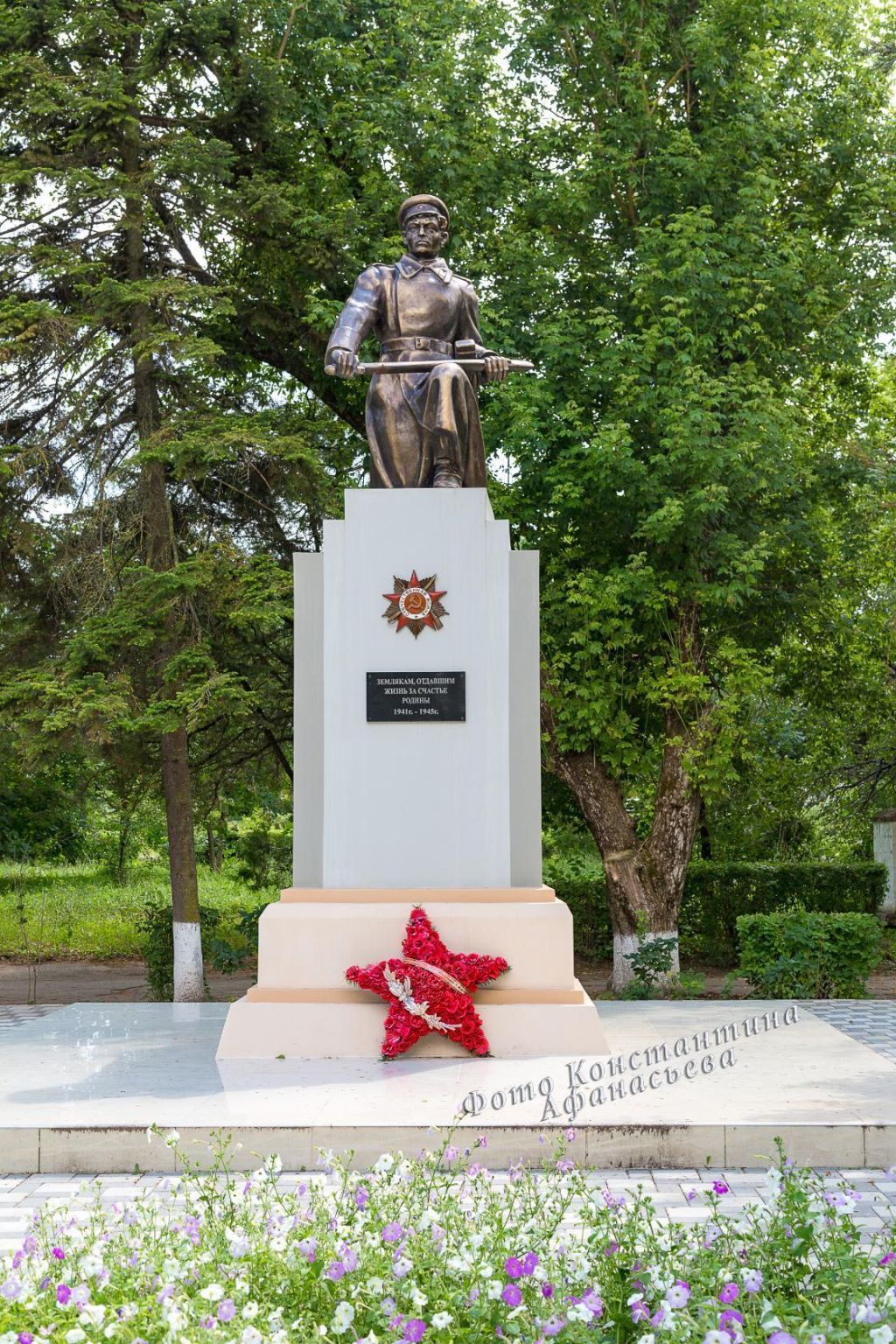 - высокий профильный постамент серого бетона с фактурой «под шубу», установленный на плоской площадке; основание постамента - двухъярусная форма, на ней кубообразный вертикальный объём, сверху прямоугольный блок-подиум для скульптуры;- скульптура из серого бетона - коленопреклоненная на правую ногу мужская фигура в военной форме (возможно, казачьи, кавалерийские войска): застёгнутая наглухо длинная шинель, из-под левой распахнувшейся полы видна нога в сапоге; на голове форменная фуражка с пятиконечной звёздочкой. На вытянутой правой и согнутой в локте левой руке воин держит шашку, положенную горизонтально на левую ногу, согнутую в колене. На левом боку - прикреплены ножны от шашки. За правым плечом на спине висит вещь-мешок. Лицо - условный портрет мужественного, решительного человека: черты лица правильные, губы плотно сжаты, строгий взгляд устремлён прямо вдаль;- прямоугольная табличка тёмно-серого гранита, с выгравированной на ней надписью: «Землякам, отдавшим жизнь за счастье Родины 1941-1945гг.», прикреплённая на лицевой стороне постамента.Территория вокруг памятника вымощена плиткой.