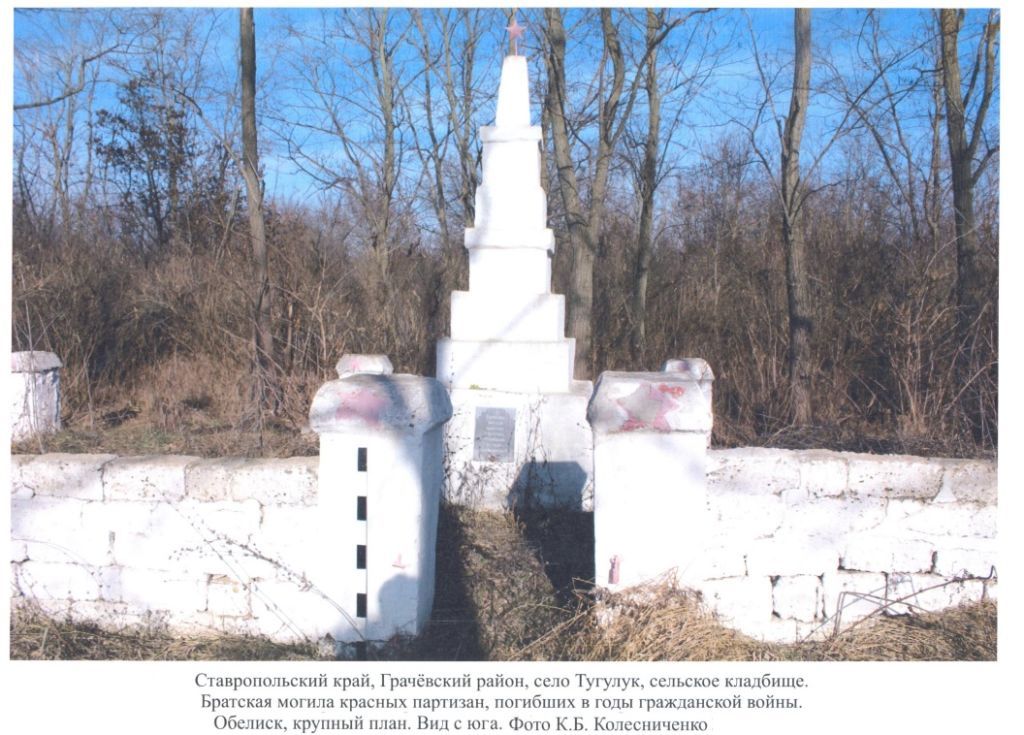 Многоярусное архитектурно - композиционное решение памятника:кубообразное трапецевидное основание - первый ярус; на лицевой грани вмонтирована плита из серого гранита с выгравированным текстом: «Братская могила красных партизан, погибших в годы гражданской войны»; угловые части плиты декорированы орнаментальными виньетками с геометрическими и растительными мотивами;двухступенчатый постамент - второй ярус; кубообразный, приближенный к квадрату объем, завершающийся выступающим карнизом - третий ярус; два уменьшающихся кубообразных объема, поставленных друг на друга и завершающихся выступающим карнизом - четвертый ярус;четырехгранный пирамидальный усеченный обелиск, венчающийся металлической пятиконечной красной звездой на высоком стержне, завершает сооружение;длинная каменная глухая невысокая ограда с лицевой стороны, слева и справа сложена из пиленого камня; в центре оставлен свободный проход к памятнику; проход и углы ограды фланкированы возвышающимися четырехгранными пилонами; завершающимися трапецевидным с плоской верхней площадкой карнизом; на лицевых гранях карнизов - барельеф пятиконечной звезды, окрашенной в красный цвет; боковые грани ограды отсутствуют; от задней ее части сохранились только четыре осевых пилона.Памятник и ограда выполнены из бетона, гладко оштукатурены, окрашены в белый цвет.