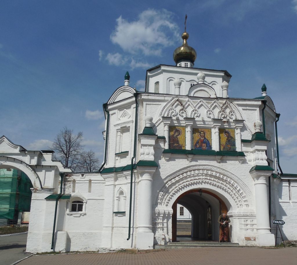 Предметом охраны объекта культурного наследия федерального значения «Церковь над «Святыми вратами», входящего в состав ансамбля, является:1) месторасположение на территории ансамбля;2) объемно-планировочное решение трехъярусного сооружения со сквозным проездом и двухсветным храмом, увенчанным барабаном с главкой, в пределах исторических капитальных стен на середину ХIХ века: восьмигранная конфигурация плана; габариты, включая всю высоту и ярусность;3) материалы на середину ХIХ века: фундамент (бутовый); капитальные стены и полуциркульное арочное перекрытие с распалубками сквозного проезда (кирпичные);4) форма крыши (второй ярус (сложная многоскатная); восьмигранный барабан с нишами, увенчанный луковичной главкой с бусиной (восьмигранная); материал кровли (фальцевое покрытие из кровельного железа); исторические высотные отметки;5) стилевое решение фасадов первого и второго ярусов в формах «уральского барокко» ХVIII века, третьего яруса в формах эклектики ХIХ века;6) композиционное решение всех фасадов на середину ХIХ века;7) все виды архитектурно-декоративного убранство фасадов в «кирпичном стиле» на середину ХIХ века (расположение, пропорции, профили, форма, рисунок декора и материал): карнизы; фризы; тяги; трехчетвертные колонны; сложные наличники с полуколонками, декоративными завитками и зигзагами; перспективный южный портал из четырех рядов; ниши, филенки, рельефы, зубчики, сухарики и балясины;8) наружные и внутренние оконные и дверные проемы и ниши на середину ХIХ века (количество, расположение, форма (прямые и полуциркульные) и размеры);9) штукатурные профилированные обрамления дверных проемов в проходной арке и помещениях второго этажа;10) отделка фасадов: неоштукатуренная поверхность стен, выполненная открытой лицевой кирпичной кладкой с известковой затиркой; гладкая штукатурка внутренних стен проездной арки;11) внутренняя планировка, расположение, габариты и конфигурация всех помещений на середину ХIХ века;12) своды и распалубки боковых помещений на середину ХIХ века;13) внутренняя двухмаршевая лестница с глухим ограждением, решетка-ограждение прохода на лестницу, настенные рельефные кресты и пристенная каменная скамья в боковом западном помещении на середину ХIХ века (расположение, материал, пропорции, форма и рисунок);14) решетки окон (расположение, материал (металл), пропорции, профили, форма и рисунок);15) стяжки (расположение и материал (металл);16) опоры, ниши, арки, распалубки, паруса и восьмилотковый сомкнутый свод храма с распалубками на середину ХIХ века (расположение, материал, пропорции, профили и форма);17) напольные плиты помещения храма (расположение, материал (чугун), пропорции, профили, рисунок и форма).