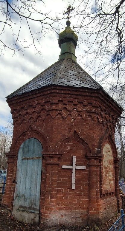 Предметом охраны объекта культурного наследия, входящего в состав ансамбля, является:1)месторасположение в центральной части территории кладбища;2)объемно-планировочное решение в пределах капитальных стен на первую половину XIX века: восьмерик с шатровым завершением и луковичной главкой с крестом; габариты и этажность (одноэтажное);3)строительные материалы и конструкции:фундамент (бутовый);капитальные стены (кирпичные); шатровый свод (кирпичный); все виды кирпичных перемычек;4)крыша: форма (шатровый восьмигранный купол с луковичной главкой на высоком барабане и с крестом на яблоке); конструкции; исторический материал покрытия кровли шатра (гладкое кровельное железо с ромбовидными фальцами); металлический крест; высотные отметки;5)все виды архитектурно-декоративного убранства в формах «кирпичного» стиля на первую половину XIX века (расположение, пропорции, профили, форма, рисунок декора и материал): венчающий профилированный карниз; два яруса аркатурных поясов и пояс сухариков во фризовой части; кордон цоколя; парные полуколонки с капителями по углам восьмерика; килевидные профилированные архивольты и арки с рельефными крестами; рамочные кирпичные наличники с треугольными сухариками по низу; все виды фигурного кирпича;6)оконные и дверные проемы и ниши на первую половину XIX века (расположение, размеры и форма (с полуциркульным завершением);7)месторасположение входной группы на северо-западном фасаде;8)вид отделки фасадов: открытая кирпичная кладка без оштукатуривания и окраски;9)все виды сохранившихся кованых изделий (ажурные решетки оконных проемов).
