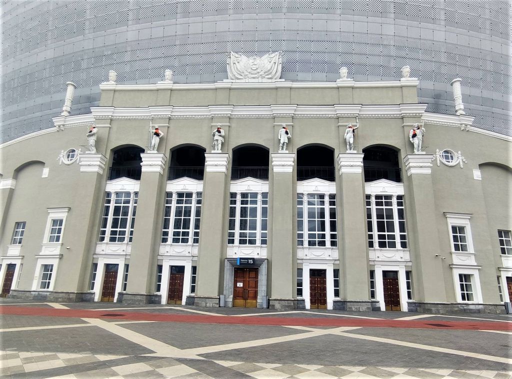 Предметом охраны объекта культурного наследия \"Фасад западной трибуны главной спортивной арены\" (памятника), входящего в состав ансамбля, являются:Объемно-пространственная' и планировочная композиция: западная стена переменной высоты криволинейная в плане (1/4 окружности) с центральным ризалитом, с плавным повышением верхнего обреза стены от торцов к углам ризалита;Строительные конструкции: кирпичная стена, гранитные плиты цоколя;Композиционное решение и архитектурно-декоративные элементы: фасад симметричной композиции в стиле «советской неоклассики»: центральный ризалит на пять оконных осей с аттиком, шесть полуколонн прямоугольного сечения со стилизованными капителями для круглых скульптур, угловые и рядовые раскрепованные лопатки ризалита и аттика, профилированный венчающий карниз с иониками, профилировавши венчающий карниз аттика с постаментами для ваз и кубков; прямоугольный профилированный портал центрального входа, тройные окна второго яруса, лучковые проемы третьего яруса, полуколонны на постаментах, поддерживающие стилизованные фронтоны, подоконные филенки с фестонами; тематические скульптурные изображения людей в технике круглой скульптуры, на аттике парные вазы и герб РСФСР на знаменном фоне, фланкирующий аттик кубки; зеркальная симметрия парных частей фасада с восходящими линиями венчающих карнизов с иониками, ритмический ряд девяти пар разновысоких ниш завершенных скошенными лучковыми арками, простенки между нишами оформленные под стилизованные пилястры, чередующиеся одинарные тройные проемы первого этажа на десять пар осей, прямоугольные оконные проемы второго этажа на восемь пар осей, круглые окна, обрамленные факелами с лентами и фестонами, обрамления дверных и оконных проемов, подоконники и филенки второго этажа, профилированные сандриками над проемами первого и второго этажей, кронштейны, фестоны, геральдическая арматура; деревянные филенчатые двери, трехчастный симметричный прямоугольный рисунок расстекловки окон первого и второго этажей; гранитный двухчастный цоколь с валиком, оштукатуренная фактура стены, окраска по штукатурке в единый цвет и тон с фасадами касс и столбов ограды, с выделением цветом архитектурного декора и скульптуры.
