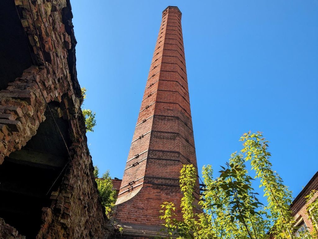 1. Местоположение объекта в планировочной структуре завода.2. Объемно-пространственная структура, габариты и высотные отметки восьмигранной расширяющийся от основания дымовой трубы на четверике на высоком прямоугольном объеме цоколя.3. Конструктивная схема:- подлинные кирпичные стены, выложенные из кирпича на известковомрастворе;- сводчатая кирпичная перемычка входного проема;- металлические закладные ступени лестница на всю высоту трубы;- металлические пояса-обоймы по периметру ствола трубы.4. Архитектурно-художественное решение фасадов:- материал и отделка фасадов: лицевой кирпич;- оформление цокольной части угловыми лопатками и прямоугольнойнишей по центру каждой стороны, переходящими в широкий фриз иступенчатый карниз со вставками белого камня;- ствол трубы со вставками белого камня у основания и оголовка;- оголовок трубы с аркатурным поясом и горизонтальными профилями совставками белого камня.