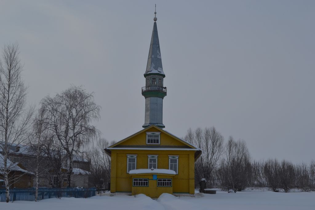 -местоположение здания мечети, входящего в комплекс деревенской усадьбы МХ в.-объемно-пространственная и композиционная структура одноэтажного деревянного дома: прямоугольный в плане сруб шестистенок с цокольным этажом, выступающим прямоугольным михрабом и восьмигранным трехъярусным минаретом с шатровым завершением на двускатной крыше (воссоздан), вход в здание через дощатые сени на северном фасаде;-подлинные бревенчатые стены, подлинный каменный цоколь, деревянные перекрытия;-историческая конфигурация, геометрия и конструкция двускатной крыши с треугольными фронтонами, двускатная крыша с треугольным фронтоном михраба, завершение минарета (восьмигранный шатер воссоздан), материал покрытия кровли — железо; объемно-планировочная система анфиладных залов;-отделка и декоративное убранство фасадов: обшивка сруба и михраба тесом, обшивка фронтонов диаганальным тесом, обшитые тесом пилястры по углам дома и по длине здания (в месте примыкания внутренней поперечной стены) с вертикальной обшивкой в зоне капителей, прямоугольные рамочные наличники оконных проемов с подкарнизными досками и прямолинейными сандриками в завершении, прямоугольные оконные проемы в тимпанах фронтонов, неширокий фриз с полочкой и карниз большого выноса из обшивных досок по периметру здания,-местоположение и габариты оконных и дверных проемов, геометрия столярных заполнений оконных проемов (деревянные двойные рамы в раздельных коробках).