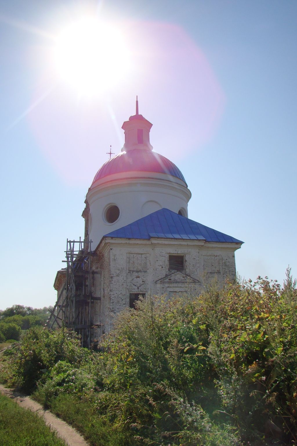 -местоположение здания, композиционные характеристики в структуре застройки (является архитектурной доминантой села);-объемно-пространственная и планировочная структура трех престольного двухсветного храма, где по главной оси здания следуют: апсида прямоугольная, двухсветный центральный объем храма, квадратный в плане, с завершением в виде ротонды под сферическим куполом и главкой на кирпичном барабане со сквозными щелями - двухсветная трапезная с скругленными углами - четырехъярусная колокольня с высоким сквозным третьим ярусом звона;-объемно-планировочные и конструктивные особенности;-существующие габариты и общий абрис объемов храма;-архитектурный облик фасадов храма;-конструктивная схема, подлинные кирпичные стены, сводчатые кирпичные перекрытия, кирпичные перемычки;-габариты и геометрия крыши (полусферический каменный купол с завершающей главкой на кирпичном барабане в завершении храма и купольное покрытие в завершении шатрового покрытия колокольни), материал кровли (листовое железо);-отделка и архитектурные детали фасадов: гладкие без штукатурной отделки, побеленные поверхности стен фасадов храма, пилястры плоские и угловые с профильной поверхностью, скругленные углы двухсветной трапезной, круглые оконные проемы и ниши ротонды в рельефном обрамлении, полуцилиндрические и плоские ниши различной конфигурации, большие прямоугольные, арочные и квадратные проемы второго света в рамочном обрамлении, арочный входной проем колокольни и треугольный фронтон над ним с токарной в виде лежачего полуовала в профильном обрамлении в тимпане, прямоугольные входные порталы с треугольными фронтонами, полуциркульные проемы в профильном обрамлении 2 яруса колокольни, высокие оконные проемы З яруса колокольни арочной формы со связующими тягами, поддерживающимися тосканскими колоннами у каждого проема, плоский фриз, выделенный тягой из лекального кирпича круглой ротонды;-местоположение и конфигурация оконных и дверных проемов в первоначальных габаритах, первоначальная конструкция, геометрия и материал (дерево) столярных заполнений проемов.