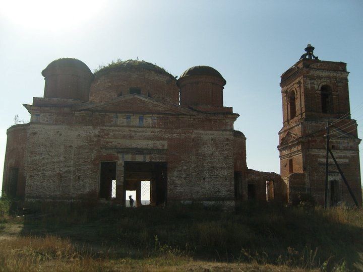 -местоположение здания церкви на юго-западной окраине села;-объемно-пространственная и симметрично-осевая композиционная структура трехпрестольного, пятиглавого, четырехстолпного храма, состоящего из: одноэтажного, квадратного в плане четверика храмовой части с цилиндрическим барабаном, покрытым плоским сводом и полусферическим купольным покрытием, и четырьмя шлемовидными главками на глухих цилиндрических барабанах с полусферическими купольными покрытиями (три покрытия утрачены) по углам церкви, полукруглой апсиды под конхой (утрачена), треугольного выступа с западной стороны четверика храмовой части и трапезной на ширину западного выступа, прямоугольной в плане под двускатной крышей, и двухъярусной, квадратной в плане колокольни с равновеликими четвериками и 2 ярусов с полусферическим куполом в завершении (утрачен) в завершении четвертого яруса (купольное покрытие, барабан и главка утрачены), вход через прямоугольные дверные проемы северного и южного порталов храмовой части, и через прямоугольный дверной проем в нижним четверике с западной стороны колокольни;-существующие габариты и общий абрис объемов церкви, архитектурный облик фасадов церкви;-конструктивная схема, подлинные кирпичные стены, сводчатые перекрытия, трехнефная с четырьмя столбами храмовая часть, кирпичные перемычки, металлические связи;-подлинная историческая конфигурация, геометрия и конструктивное решение крыши, купольное покрытие полусферического свода храмовой части, полусферические купольные покрытия шлемовидных главок, треугольные фронтоны четверика храмовой части;-архитектурные детали фасадов: поверхности стен фасадов из красного кирпича без штукатурной отделки с белой известковой промазкой, плоские лопатки на цилиндрических барабанах, высокие контррельефные арки с вписанными прямоугольными окнами с профильными клинчатыми перемычками на апсиде и треугольном пристрое, треугольные фронтоны в завершении раскреповок центральных частей северного и южного фасадов храмового объема с полосами профилированных тяг и гут, два портала входов в храмовую часть с двупольными дверными проемами, фриз из укароченных лопаток по периметру четверика храмовой части и 1 яруса колокольни, полосы профилированных карнизных тяг во фризе и в завершении объемов церкви и ярусов колокольни, треугольные фронтоны в завершении яруса колокольни с полосами гут и карнизов, арочные проемы звонницы в обрамлении архивольтов с опиранием на импосты и фланкированные пилястрами, антаблемент в завершении колокольни с профилированными карнизами и арочными нишами с четырех сторон в обрамлении тяг и полос сухариков, подоконные и карнизные профилированные тяги в завершении объемов и ярусов церкви, профильные прямоугольные ниши над входными порталами храмовой части и над проемами 1 яруса колокольни;-ажурные кованые решетки оконных проемов;-местоположение, габариты и пропорции первоначальных оконных и дверных проемов, геометрия столярных заполнений оконных проемов.