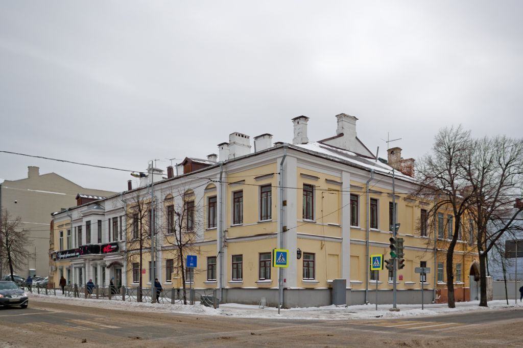 Описание предмета охраны:- местоположение здания, градостроительные и композиционные характеристики в с структуре исторической застройки, расположен по красной линии на углу улиц Карла Маркса и Лобачевского;- объемно-пространственная структура двухэтажного здания П — образной в плане формы, с антресольным третьим этажом в дворовой части, и двухэтажной частью со сквозным проездом по ул. Лобачевского, с чердачным и подвальным помещениями;- габариты, геометрия и конструктивное решение крыши, материал кровли (металлическая фальцевая), исторические слуховые окна, дымоходы (месторасположение и габариты), трехскатное завершение эркера;- конструктивная схема: подлинные кирпичные стены, своды «Монье» в сквозной арке и в тaмбype, габариты и месторасположение исторической лестницы, конструктивное решение эркерного балкона, подлинные кирпичине перемычки, своды подвального помещения трехциркульной конфигурации;- композиция и архитектурное решение фасадов здания: двухчастное деление главного фасада по ул. К. Маркса, в левой части эркер, ризалит со скомпонованными no три оконными проемами, симметрично решенная правая сторона главного фасада с прямоугольными одинаковой ширины окнами; фасад по улице Лобачевского ассиметричен — справа находится пpoeзднaя арка; дворовые фасады с антресольным третьим этажом и двухэтажная часть без антресольного этажа;- отделка и архитектурные детали фасадов: фасады по ул. К. Маркса и Лобачевского: материал отделки фасадов — штукатурка, покраска. Ступенчатые междуэтажные, венчающие карнизы, тонкие подоконные карнизы окон второго этажа, прямоугольные профилированные сандрики над окнами 2-гo этажа, профилированные подоконные полоски окон первого этажа, рустованные ризалиты главного фacaдa с эркерным балконом на 2 этаже, трехчастные окна на ризалите с венчающими их лепными элементами в виде венка и факелов, лепной кронштейн входной группы фасада по ул. К.Маркса, вертикальные плоские лопатки в северо-западной части здания, аркада на 2 этаже главного фасада, рустованный ризалит бокового фасада, декорированной лепной тягой и замковым камнем и венчающий трехчастный аттик с трехскатным покрытием. Внутридворовые фасады: материал отделки фасадов — штукатурка, покраска. Плоские подоконные полочки под окнами антресольного этажа на прямоугольных кронштейнах, многоступенчатый венчающий и междуэтажный карниз;- местополдожение, пропорции, геометрия исторических столярных заполнении оконных проемов; материал заполнений — дерево;- элементы декоративного убранства интерьеров: историческая лестница со ступенями из мозаичного бетона с валиком и подсечкой и историческим: кованым фигурным ограждением с деревянным поручнем, подоконная плита с валиком окна лестничной площадки, потолочные тяги; лестничные тяги, лепной кронштейн в подъезде, историческое покрытие полов метлахская плитка на лестничных площадках.