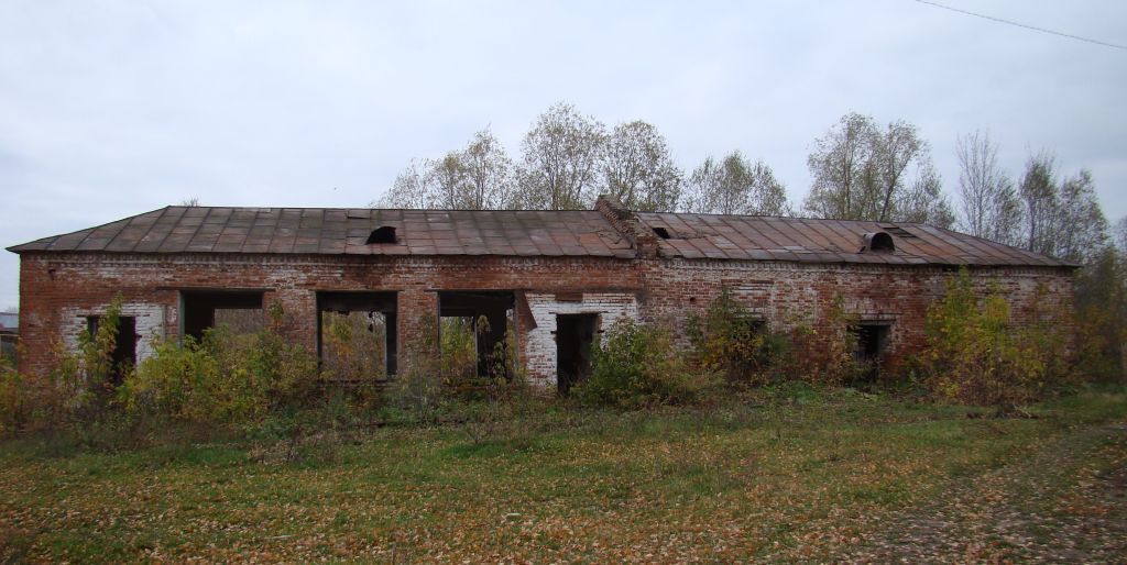 Здание склада.-местоположение здания хозяйственной постройки, входящего в комплекс деревенской усадьбы, в непосредственной близости от главного дома; объемно-пространственнаяи композиционная структура одноэтажного кирпичногоздания на разновысоком цоколепод четырехскатной вальмовой крышей;-конструктивная схема, подлинные кирпичные стены, кирпичные перемычки сохранившихся исторических оконных и дверных проемов;-историческая конфигурация, геометрия и конструкция скатной крыши, материал покрытия кровли — железо;-архитектурный декор фасадов: гладкие поверхности стен без штукатурной отделки, прямоугольные исторические оконные проемы в обрамлении рамочных профильных наличников и с прямолинейными сандриками в завершении, дверной проем в профильном обрамлении, полосы зубчиков поребриков в подкарнизной части по периметру здания;-местоположение, конструкция и геометрия исторических заполнений оконных и дверных проемов.