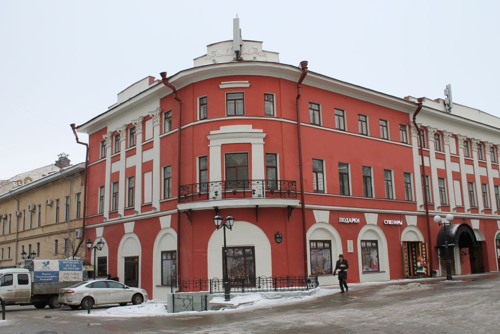 1. Местоположение объекта на углу ул. Баумана и М. Джалиля, видовые раскрытия с улиц Баумана, М. Джалиля и Профсоюзной;2. Объемно-планировочная и композиционная структура трехэтажного с подвалом Г-образного в плане здания, со скругленным углом в северо-восточной его части и проездной аркой ( со стороны ул. Баумана), имеющего разновысотные объемы в композиционной структуре фасадов и двухэтажный разновысотный флигель, присоединенный металлической лестницей, составляющие вместе единый Побразный абрис здания в плане (графические схемы №1-5);3. Конфигурация и конструкция крыш, материал (листовое железо с фальцевым соединением), в том числе аттики по ул. Баумана, М.Джалиля и в угловой части; высотные отметки по конькам здания, местоположение водосточных труб;4. Композиционное решение и архитектурное оформление фасадов:- композиция парадно оформленного главного фасада по ул. Баумана с метрическим рядом окон прямоугольной формы в 19 оконных (ниш) осей по верхним этажам, где центральная часть в 9 оконных осей (ниш) оформлена в уровне второго и третьего этажей портиком с десятью пилястрами с коринфскими капителями (воссозданы) и завершенным ступенчатым аттиком; аркада первого этажа в виде ниш с веерными замковыми камнями и оконными проемами, где 5я арка слева является проездной во двор; профилированный межэтажный и подоконный карнизы; воссозданные рокайльные панно над окнами второго этажа в портике, сандрикиполочки окон второго этажа, модульоны в виде лент над окнами второго этажа; оконные и дверные проемы прямоугольной формы;- композиция угловой части здания в три оконные оси по третьему этажу завершенная ступенчатым аттиком; прямоугольное обрамление окна (раннее выход на балкон) второго этажа, состоящее из двух лопаток, поддерживающих антаблемент, увенчанный аттиком, сандрик-полочка окна третьего этажа; арочная ниша первого этажа; балкон с металлическим ограждением (подлинный утрачен); оконные идверные проемы прямоугольной формы;- композиция парадно оформленного главного фасада по ул. М. Джалиля, состоящая из двух разновысотных частей:- более низкая левая часть в 1 О оконных осей по третьему этажу ( три оконные оси слева завершены ступенчатым аттиком), оконные проемы первого этажа: оконные и дверные проемы (три слева) лучковые с профилированными наличниками (ныне перебиты), остальные окна прямоугольные без оформления; междуэтажья (между 1 и 2 этажами): лучковые без оформления ( 4-8 проемы ныне перебиты); верхнего этажа: прямоугольные, через одну оконную ось поочередно оформлены сандриками-полочками (утрачены); аркада первого этажа в виде ниш с веерными замковыми камнями (утрачена), междуэтажные и подоконные профилированные тяги;- более высокая часть справа в уровне верхних этажей оформлена парадным портиком с четырьмя пилястрами с коринфскими капителями (воссозданы) и завершенным ступенчатым аттиком; аркада первого этажа в виде ниш с оконными проемами с веерными замковыми камнями; воссозданные рокайльные панно над окнами второго этажа в портике, модульоны в виде лент над окнами второго этажа, междуэтажные и подоконные профилированные тяги; оконные и дверные проемы прямоугольной формы;- дворовые фасады основного объема и флигеля с прямоугольными оконными и дверными проемами без декора, междуэтажные и подоконные тяги;- деревянная в