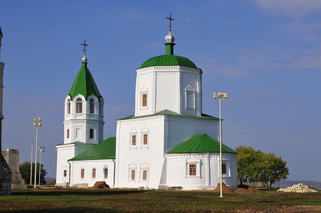 1. Местоположение объекта и его роль в объемно-пространственной композиции Болгарского городища, а именно, в его северной части; существующие визуальные связи с ближайшими объектами культурного наследия - Соборная мечеть и Большой минарет, Ханская усыпальница;2. Конфигурация крыш и кровельных завершений (фальцевая кровля), материал и характер кровельного покрытия (листовое железо), высотные отметки; местоположение крестов в завершении главок;3. Объемно-планировочная структура здания: восьмерик под сомкнутым сводом на двусветном четверике; восьмигранное купольное покрытие свода восьмерика с главкой на глухом восьмигранном барабане; широкая апсида на высоту одного этажа, примыкающая к четверику с восточной стороны; квадратная одностолпная трапезная шире храмового объема, примыкающая к четверику с запада, и выступающая с северной стороны; восточный фасад выступа трапезной, оформленный полукруглой апсидой придела и главкой на барабане; колокольня, смещенная от храмовой оси в северную сторону; композиция трехъярусной колокольни по типу: «два восьмерика на четверике», широкий восьмигранный шатер в завершении, главка на глухом восьмигранном барабане; два контрфорса в высоту первого яруса по восточной стене четверика;3.Композиционное решение и архитектурно-художественное оформление фасадов; конфигурация, местоположение, конструктивное решение оконных и дверных проемов, перемычки; материал и характер обработки фасадных поверхностей (обмазка по кирпичу, при которой питается кирпичная кладка); материал оконных заполнений (дерево - утрачен), кованые металлические двери на петлях в дверном проеме западного фасада колокольни; местоположение входного проема лучковой формы со стороны западного фасада колокольни, акцентированного высокимипилястрами с профильными капителями, объединенными простым архивольтом с килевидным элементом по центру; пилястры с профильными капителями по углам четверика колокольни, профильный карниз небольшого выноса по периметру; прямоугольные оконные проемы по центральной оси северного и южного фасадов колокольни, рамочные наличники с прямоугольной подоконной нишей; оконные проемы лучковой формы по центральной оси граней восьмерика колокольни, заключенные в прямоугольные ниши; чередование окон с ложными окнами; карниз с рядом городков в завершении нижнего яруса восьмерика; оконные проемы арочной конфигурации восьмерика колокольни, заключенные в арочные ниши; профильная подоконная тяга с подоконными нишами прямоугольной формы; угловые пилястры граней восьмерика с карнизами; завершение оконных проемов в виде килевидных кокошников; профильная карнизная тяга и прямоугольные оконные проемы трапезной, в прямоугольных нишах с подоконными полочками; прямоугольный дверной проем северного фасада четверика в неглубокой нише, обрамленный стилизованным барочным наличником и профильным элементом квадратной формы по оси; местоположение и прямоугольная форма оконных проемов ярусов двусветного четверика, восьмерика с ложными окнами, заключенных в неглубокие профильные ниши; стилизованные барочные оконные наличники с полуколонками, профильными подкарнизными и карнизными полочками на консолях, фигурным сандриком в завершении; квадратная форма барочных наличников первого яруса четверика 