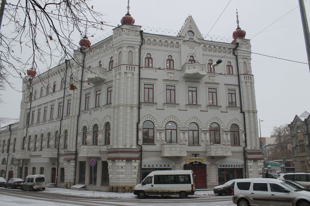 -местоположение здания на пересечении улиц Горького и Галактионова, его градостроительные и композиционные характеристики в структуре исторической застройки (закрепляет красные линии застройки), территория домовладения в сложившихся границах;объемно-пространственная структура углового ( со срезанным углом) четырехэтажного здания с тремя уличными фасадами в виде неправильного незамкнутого каре и трехэтажной частью по ул.Галактионова с уменьшением высоты первого этажа из-за перепада рельефа (склон) в сторону двора, с ризалитом-башней в западной части здания, с полукруглым ризалитом, расположенным в углу со стороны двора, с раскрепованными частями фасадов по ул.Горького и Галактионова и в обрамлении углов, большими по высоте; с организацией входных узлов с уличных и дворовых фасадов;-конструктивная схема, подлинные кирпичные стены на белокаменном цоколе, кирпичные перемычки, местоположение и геометрия исторических лестниц; местоположение, конструктивное решение и конфигурация балконов;-историческая конфигурация, геометрия и конструктивное решение скатной крыши со щипцовыми завершениями фасада по ул.Горького, углового фасада и трехэтажной части по ул.Галактионова; историческая конфигурация луковичных главок с ажурными шпилями; шатровое завершение ризалита-башни с ажурным шпилем; парапетная металлическая решетка геометрического рисунка, материал покрытия кровли (листовое железо);-композиция и архитектурное решение фасадов: срезанная угловая часть, акцентированная раскреповкой на высоту четвертого этажа и завершающаяся шпицам; вертикальное членение уличного фасада по ул.Горького раскреповками на пять неравных частей с центральной раскрепованной частью в три оконные оси, уличного фасада по ул.Галактионова на две неравные части; горизонтальное членение фасадов на два разновеликих яруса с нижним ярусом в один этаж и более высоким вторым ярусом в три этажа; местоположение, конфигурация и пропорции исторических оконных и дверных проемов; отделка и архитектурные детали фасадов: гладкие оштукатуренные и окрашенные поверхности стен фасадов здания с оштукатуренными и окрашенными декоративными элементами; лучковые проемы 1-го этажа срезанной угловой части, полуциркульные оконные проемы 2-ro этажа со стрельчатыми архивольтами в обрамлении на профилированных импостах и декоративными трехчетвертными колонками с фигурными выступающими элементами, полуциркульные оконные проемы 2-го этажа с профилированными наличниками с рустованной межоконной плоскостью, прямоугольные оконные проемы 3-го этажа с профилированными наличниками, профилированными подоконными полочками и выступающими фигурными элементами, полуциркульные оконные проемы с профилированными наличниками и трехчастные оконные проемы 4-ro этажа в обрамлении; лучковые, арочные и стрельчатые окна трехэтажной части по ул.Галактионова в обрамлении профилированных наличников; оформление центральной раскрепованной части уличного фасада по ул.Горького в виде сдвоенных и строенных трехчетвертных колонн с базами и стилизованными капителями на высоту второго этажа, несущими антаблемент, декорированный круглыми заглубленными элементами и профилированными тягами с полосой «сухариков»; сдвоенных и строенных трехчетвертных колонн на высоту 3-го и 4-го этаж