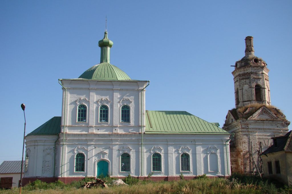 -местоположение здания церкви;-объемно-пространственная и симметрично-осевая композиционная структура двухпрестольного храма, состоящего из: одноэтажного прямоугольного в плане здания трапезной под двускатной вальмовой крышей, кубического двухсветного четверика храма под сомкнутым сводом (главка утрачена), одноэтажной полукруглой в плане апсиды под конхой, и двухъярусной колокольни, состоящей из четверика нижнего яруса с купольным покрытием с четырьмя треугольными фронтонами, переходящим в восьмерик звонницы с купольным покрытием из сомкнутого свода с четырьмя круглыми слуховыми проемами в основании и с восьмигранным глухим барабаном главки в завершении (главка утрачена), соединительного шлюза колокольни с трапезной, входы в церковь через арочные проемы северной и южной стороны храмовой части и через арочные проемы в нижним четверике с западной и южной стороны колокольни;-существующие габариты и общий абрис объемов церкви, архитектурный облик фасадов церкви;-конструктивная схема, подлинные кирпичные стены, сводчатые перекрытия, кирпичные перемычки, металлические связи сводов;-подлинная историческая конфигурация, геометрия и конструктивное решение крыши, купольные покрытия сводов храма и колокольни с круглыми люкарнами и треугольными фронтонами, полукупол над апсидой;-архитектурные детали фасадов: поверхности стен фасадов из красного кирпича без штукатурной отделки побеленные, пилястры в обрамлении углов и в простенках оконных проемов объемов, наличники полуциркульных оконных проемов и фронтоны над входами с лепным декором из криволинейных волют, полосы профилированных карнизных тяг во фризе и в завершении объемов церкви, профилированные карнизные тяги с полосой сухариков в завершении ярусов и фронтонов колокольни, подоконные тяги, криволинейные филенки на восточном фасаде храмового четверика, полуциркульные входные проемы и ниша с замковыми камнями в рустованной плоскости нижнего яруса колокольни, полуциркульные проемы в обрамлении плоских архивольтов с замковыми камнями восьмерика колокольни;-кованые ажурные оконные решетки;-местоположение, габариты и пропорции первоначальных оконных и дверных проемов, геометрия столярных заполнений оконных проемов.