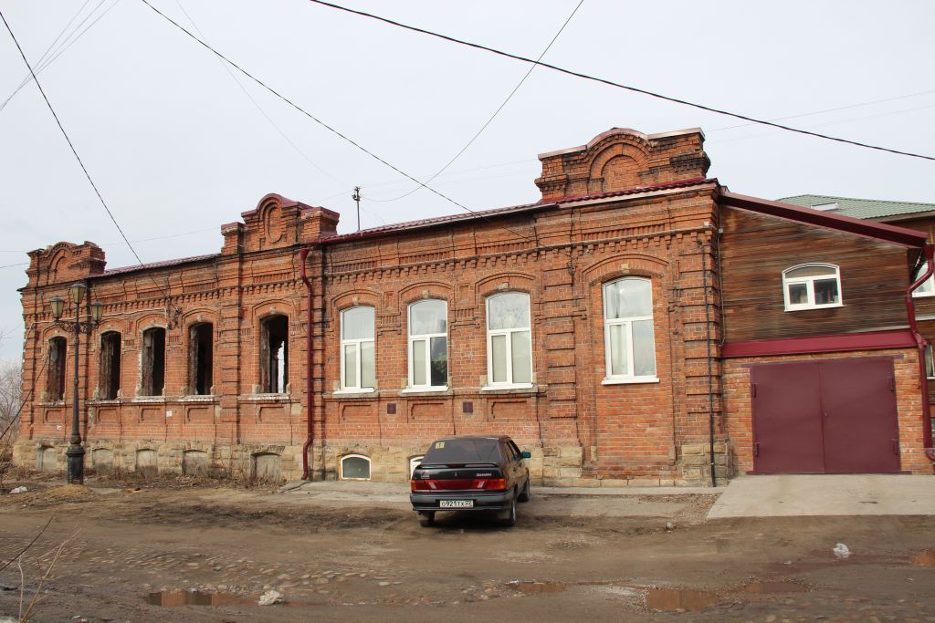 1.Градостроительные характеристики здания:1.1Расположение здания в среде исторической застройки одной из старейших улиц города – ул. Бакунина, на территории объекта культурного наследия (памятника археологии) федерального значения «Томский острог» (место основания города), в зоне градостроительного расположения объектов культурного наследия регионального значения. Местоположение здания в строчке периметральной застройки квартала, главным (восточным) фасадом по красной линии ул. Бакунина.1.2Здание входит в состав исторической усадьбы кон. XIX – нач. ХХ вв. и занимает главенствующее положение в структуре домовладения – главный жилой дом.1.3Габариты здания на дату строительства нач. ХХ в. и его силуэт акцентированный тремя фигурными аттиками.1.4Секторы и направления видовых раскрытий здания при его восприятии с ул. Бакунина и с дворовой территории усадьбы.2.Объемно-пространственная композиция здания на дату строительства нач. ХХ в. Одноэтажное кирпичное здание с подвалом (без поздних пристроек). Форма плана Г-образная, вытянутая вдоль улицы по оси север-юг. Высотные отметки по венчающим карнизам основного объема здания и аттиков.3.Конфигурация (форма) крыши – вальмовая стропильной конструкции, ее габаритные размеры и высотные отметки по коньку. Характер кровельного покрытия (листовой металл с фальцовкой и окраской). Местоположение водостоков и водосточных труб.4.Композиция и архитектурно-художественное оформление фасадов здания на дату строительства нач. ХХ в., выполненных в стиле эклектика («кирпичный» стиль):4.1Главный (восточный) фасад симметричной композиции решен в 9 осей проемов (в т.ч. один проем дверной). Три композиционные оси фасада акцентированы слабо выступающими ризалитами с аттиками в уровне крыши. Дворовый (западный) фасад решен в 8 осей окон (левая часть фасада в 3 оси окон заглублена). Южный (торцевой) фасад решен в 1 ось дверного проема, расположенного по центру. Композиция северного фасада (скрыта поздней пристройкой).4.2Местоположение и габариты основных входов: местоположение первоначального входа – по оси правого ризалита главного фасада, крупный лучковый проем (заложен). Два входа в подвал – проемы с лучковыми перемычками, расположенные на западном фасаде.4.3Местоположение, размеры и форма оконных проемов – лучковые (окна подвала меньшего размера), их габаритные размеры, форма и конструкция в кладке стены.4.4Декоративное оформление главного (восточного) фасада с применением фигурного кирпича: выступающий высокий цоколь и его декор (облицовка из песчаника в виде прямоугольного руста), рустованные лопатки в оформлении углов ризалитов, массивный профильный карниз с фризом, оформленным декором в виде поребрика и ступенчатыми «сухариками». Профильный пояс в уровне низа оконных проемов. Обрамление оконных проемов с выделением перемычки и элементами декора из песчаника (замковый камень, элементы в нижней части обрамления проема), оформлением подоконной части выступом с двойной филенкой (прямоугольной и фигурной) и обработкой граней выступа фигурной срезкой. Широкий горизонтальный пояс с декором в виде поребрика, прямоугольными нишами и треугольными «кистями» свесов обрамления перемычек (в оконных простенках). Два вида кирпичных аттиков лучковой формы на «плечиках» с боковыми столбами и их декор. Центра