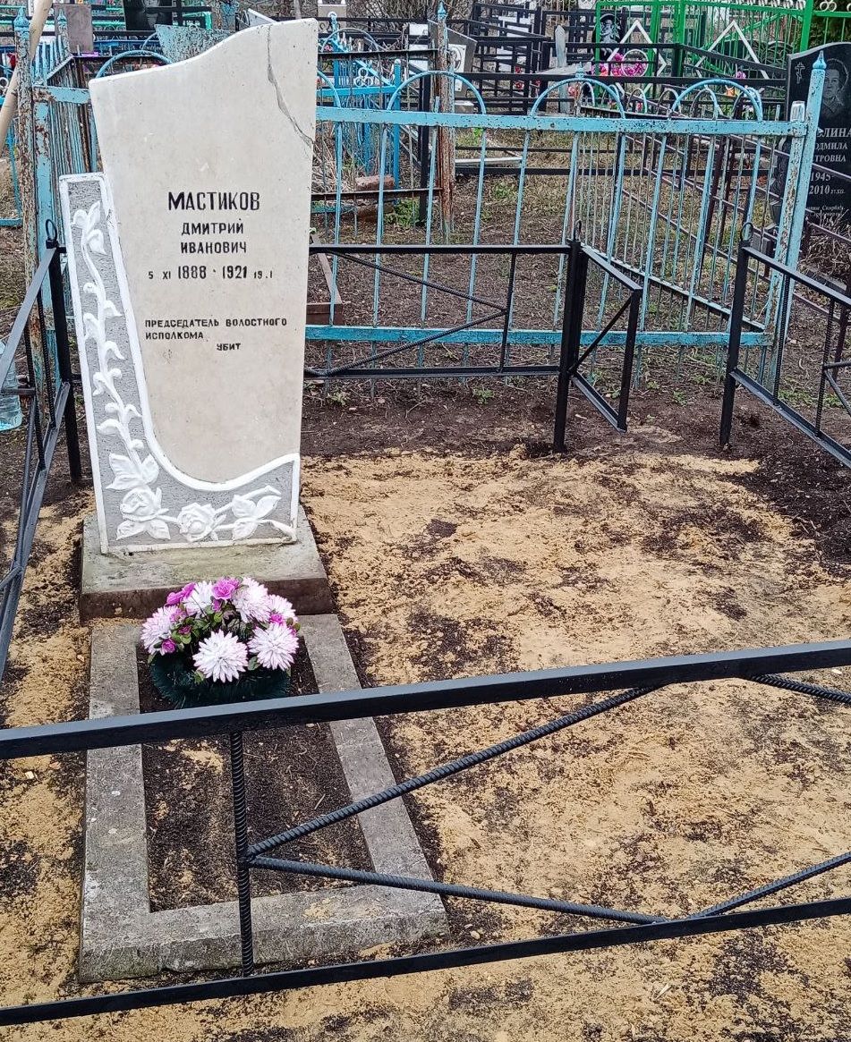Приложение к приказу инспекции от 26.10.2022 №115.Предметом охраны объекта культурного наследия регионального значения «Могила революционера Мастикова Дмитрия Ивановича», Тульская область, Кимовский район, село Монастырщина, являются:останки исторической личности – Мастикова Дмитрия Ивановича (22.10.1889 - 21.01.1921), продовольственного комиссара Куликовского волостного совета, уроженца села Монастырщина Епифанского уезда Тульской губернии;могила Мастикова Дмитрия Ивановича – организованное захоронение с останками исторической личности на территории села Монастырщина Кимовского района Тульской области.