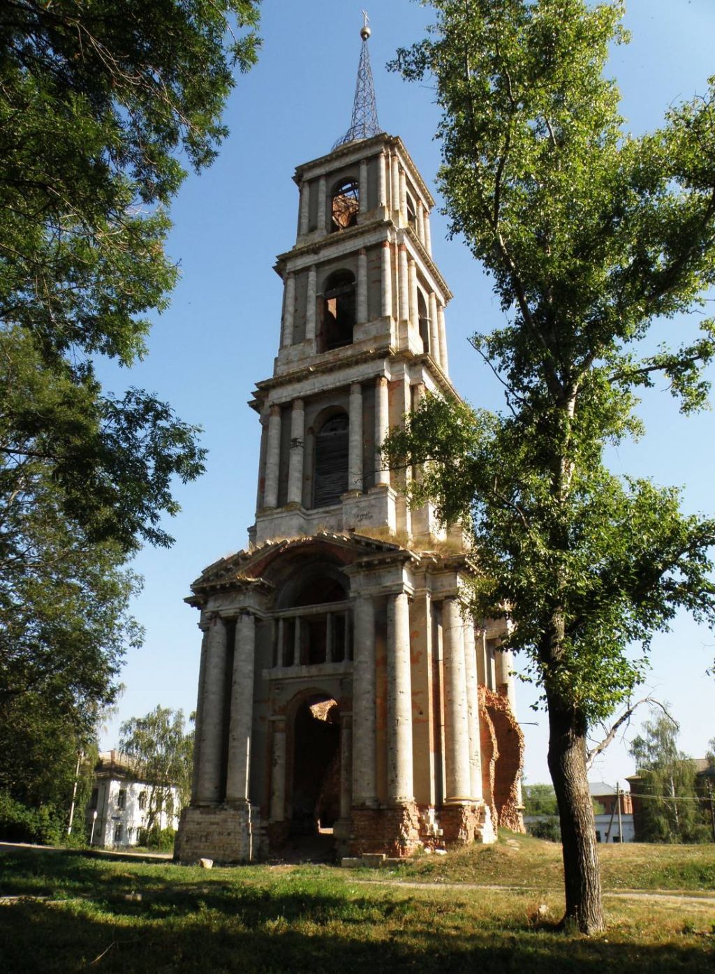 Градостроительные характеристики. Местоположение колокольни и роль в композиционно-планировочной структуре исторического ядра города, сложившееся в конце XIX века; высотная доминанта Венева, играющая важную роль в силуэте города; исторические габариты и силуэт колокольни на 1800-1860 годы; секторы и направления видовых раскрытий колокольни. Объемно-пространственная и планировочная композиция здания.Четырехъярусное квадратное в плане вертикально ориентированное сооружение, увенчанное шпилем с крестом; высотные отметки карнизов ярусов и шпилевидного завершения.Пространственно-планировочная структура здания колокольни в пределах капитальных стен.Местоположение утраченных боковых южного и северного крыльев первого яруса, восточной паперти, перехода и утраченного церковного здания. Строительные конструкции, материал и техника исполнения.Фундаменты – бутовые ленточные.Цоколь – высокий кирпичный, облицованный белокаменными блоками, усиленный металлическими связями; тип кладки – смешанный с чередованием тычковой кладки и кладки «кирпич на ребро» .Стереобат колокольни, включая его конструкцию и материал.Белокаменный фрагмент паперти, его конструкция и материал.Фрагмент перехода в церковь, его конструкции и материал.Капитальные несущие кирпичные стены, своды, арки; кованные металлические связи с анкерами .Четыре свода нижнего яруса: кирпичные коробовые с распалубками; пять подпружных арок; кованные металлические связи.Перекрытия ярусов – плоские, деревянные.Внутристенная лестница на второй ярус, «ползущий» свод, белокаменные ступени.Белокаменный столб крепления ступеней с внутренними коваными металлическими связями.Деревянные межъярусные лестницы.Металлическая кованная конструкция полусферического купола, шпиля, подкрестного яблока, креста.Окрытие завершения колокольни, конструкция и материал.Окрытие выступающих элементов фасадов медью.Позолоченное завершение колокольни: крест, подкрестное яблоко и юбка.Фасады – оштукатурены и окрашены.Детали отделки фасадов – белый камень-известняк.Базы колонн нижнего яруса – профилированный белокаменный массив.Композиция и архитектурно-художественное оформление фасадов. Фасады нижнего яруса – высокий подиум; две пары белокаменных колонн; капители; портик с треугольным разорванным фронтоном, белокаменный фриз с карнизным пояском; белокаменные карнизы с дентикулами; сегментный проем в тимпане; арочный проем входа; двери с полуциркульной фрамугой; рисунок переплетов фрамуги; полуциркульный оконный проем второго света с заполнением.Фасады второго яруса – раскрепованый белокаменный постамент; две пары белокаменных колонн; антаблемент, полуциркульный оконный проем с историческим заполнением.Фасады третьего яруса звона – раскрепованый белокаменный постамент; две пары белокаменных колонн; антаблемент, арочный проем, металлическое ограждение.Фасады четвертого яруса звона – раскрепованый белокаменный постамент; две пары белокаменных колонн; антаблемент, арочный проем, металлическое ограждение